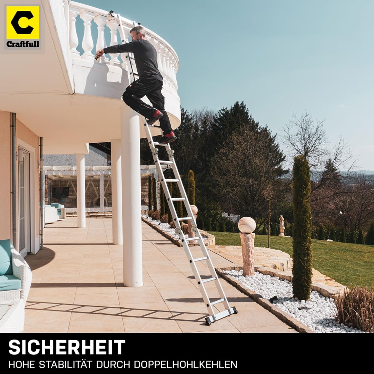 Die CRAFTFULL Aluminium Mehrzweckleiter CF-104A überzeugt durch ihre durchdachte Mechanik. Die 4×5 Sprossen bieten eine maximale Reichhöhe von bis zu 688 cm, was sie zu einem unverzichtbaren Werkzeug für Fassaden- oder Dacharbeiten macht. Durch den Klappmechanismus lässt sich die Leiter auf ein Bruchteil ihrer Gesamtlänge zusammenlegen, was den Transport im Transporter oder den Stauraum in der Garage extrem reduziert.