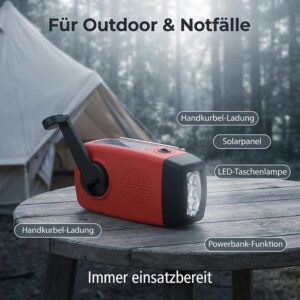- Verlässliches Notfall Kurbelradio für jeden Notfall Unentbehrliches Solar Kurbelradio für Sie und Ihre Familie – perfekt für Stromausfälle, Stürme, Überschwemmungen oder Outdoor-Camping. Dank selbstbetriebener Technologie funktioniert das Kurbelradio jederzeit, auch ohne externen Stromanschluss.