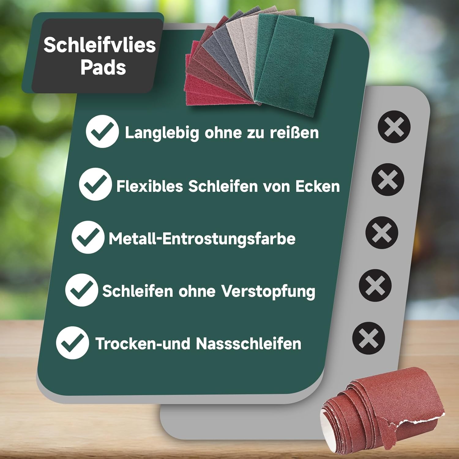 Dieses 10-teilige Schleifvlies-Set ist die ideale Lösung für ambitionierte Heimwerker und Profis, die bei der Oberflächenbearbeitung Wert auf Präzision und Vielseitigkeit legen. Mit fünf verschiedenen Körnungsklassen deckst du das gesamte Spektrum vom groben Entrosten bis hin zum feinen Finish ab und erzielst auf unterschiedlichsten Materialien professionelle Ergebnisse.