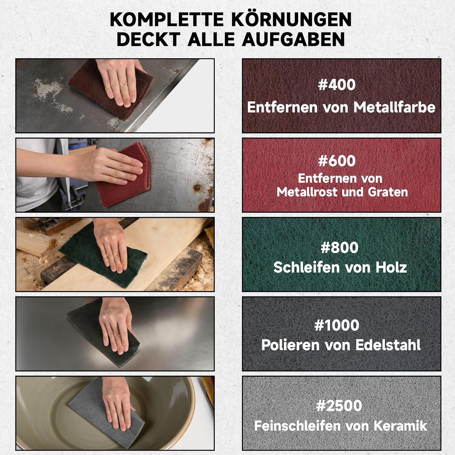 - Vollständiges Set für alle Stadien: Die Auswahl von 400 bis 2500er Körnung erlaubt einen nahtlosen Übergang von der Reinigung bis zum Polierfinish in einem Set.