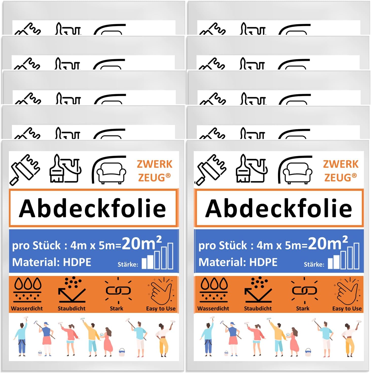 Die ZWERKZEUG Abdeckfolien sind vielseitig einsetzbar und wurden speziell für Malerarbeiten, Renovierungen sowie für Umzüge entwickelt. Sie dienen als effektiver Staubschutz für Möbel und Böden, um diese während der Arbeiten vor Verschmutzungen oder Farbspritzern zu bewahren.