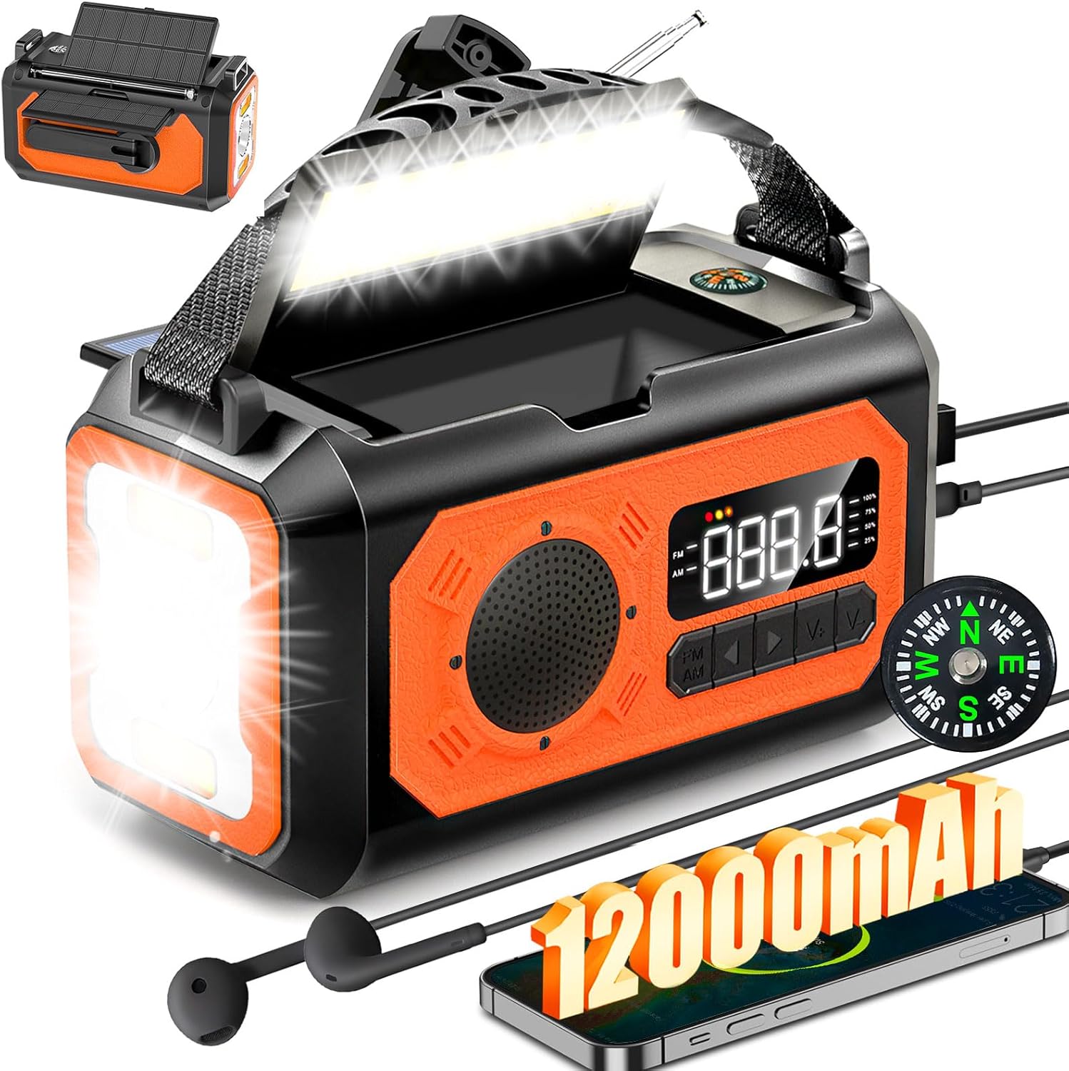 12000mAh Kurbelradio mit Handyladefunktion, Solar Radio mit 2 Sonnenkollektoren, AM/FM Tragbar Notfallradio mit Kopfhöreranschluss/Leseleuchte/LED Taschenlampe/Kompass/SOS Alarm für Camping Outdoor – Wholede