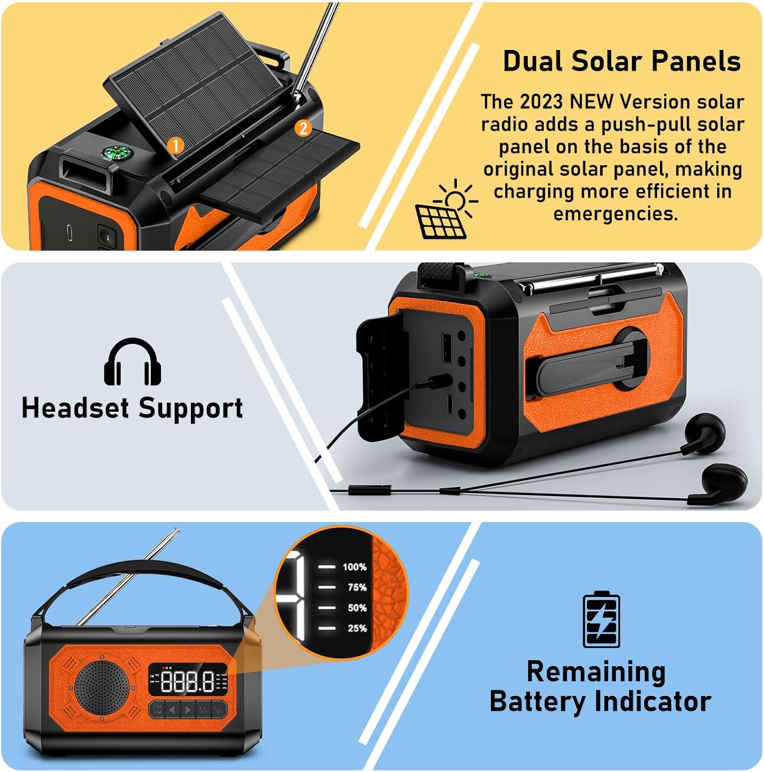 - 【Innovatives Multifunktionswunder】Dieser Notfallradio bietet: ① Mobile Stromversorgung ② AM/FM Radio ③ Taschenlampe mit drei Modi ④ LED-Leselicht ⑤ SOS-Alarm ⑥ Kopfhöreranschluss ⑦ Kompass. Das verbesserte LCD-Display bietet detaillierte Kanal- und Batterieinformationen und sorgt so für mehr Komfort. Die 40 cm lange Teleskopantenne garantiert unübertroffenen Signalempfang. Ausgestattet mit einer Kopfhörerbuchse, können Sie das Radio auch alleine genießen.