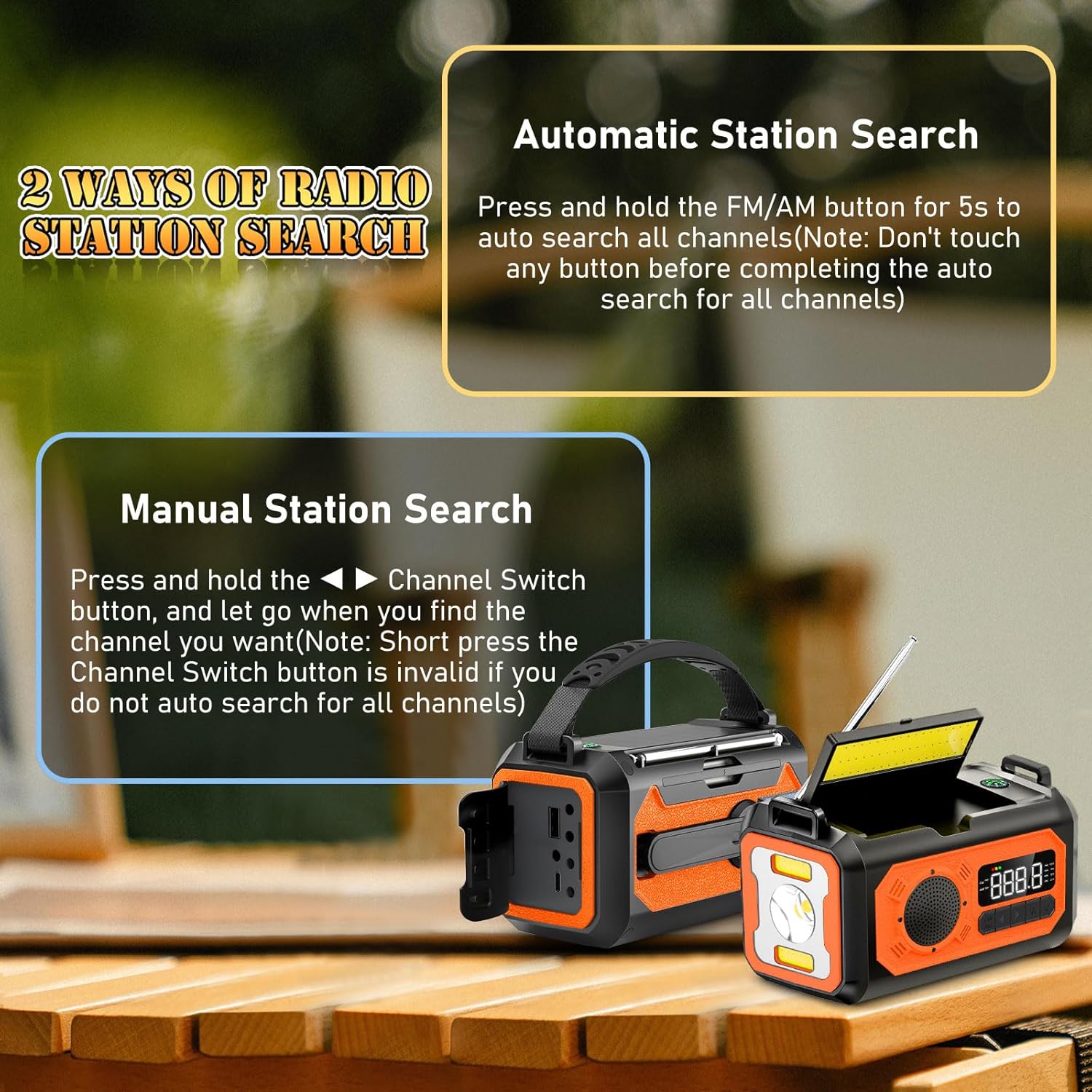 - 【Zwei Modi der Sendersuche】Unterstützt automatische Sendersuche und Manuelle Sendersuche. Verwenden Sie die automatische Suchfunktion, um alle verfügbaren Sender in Ihrem Gebiet zu suchen, und stellen Sie automatisch das stärkste Signal ein. Mit der manuellen Suchfunktion können Sie Ihre Zielsender schnell finden. Das Radio kann die gesuchten Sender automatisch speichern.
