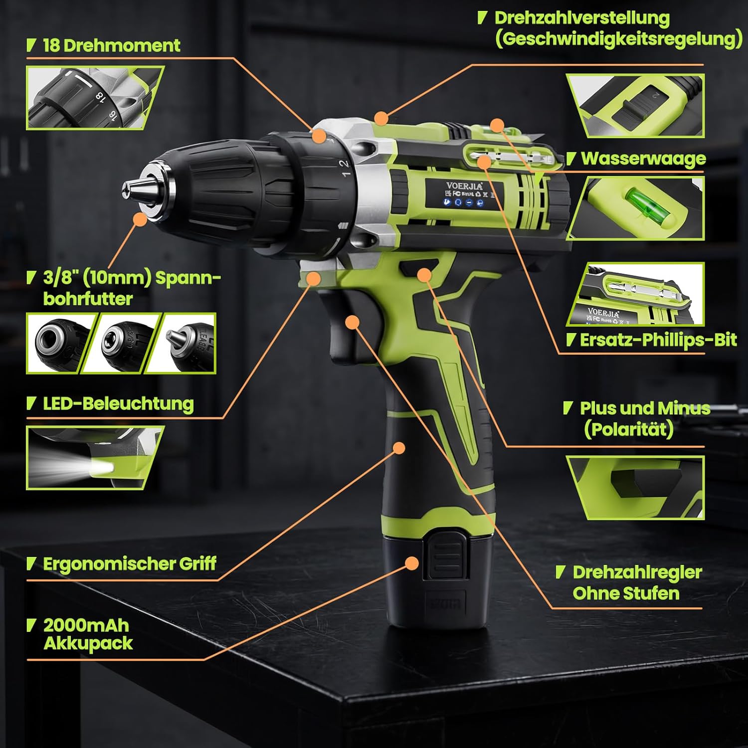 Der VOERJIA Akkubohrschrauber kombiniert kompakte Abmessungen mit solider Leistung für den Heimwerkerbereich. Das Herzstück bildet ein 12-Volt-Motor mit maximal 35 Nm Drehmoment – ausreichend für die meisten Schraubarbeiten im Haushalt. Die 18+1 Drehmomentstufen ermöglichen eine präzise Anpassung an unterschiedliche Materialien: niedrige Stufen für empfindliche Spanplatten, höhere Stufen für härteres Holz oder Metallverbindungen. Die zusätzliche Bohrstufe schaltet die Drehmomentbegrenzung ab und liefert volle Kraft fürs Bohren.