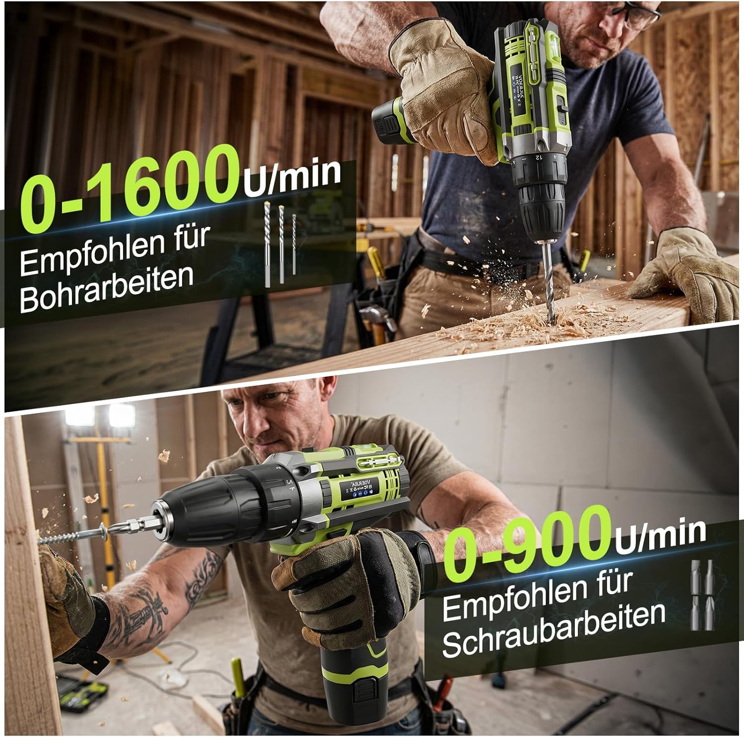 - Anpassbare Arbeitsgeschwindigkeit: 2-Gang-Getriebe (0-900/0-1600 U/min) bietet die richtige Drehzahl für kontrolliertes Schrauben und schnelles Bohren