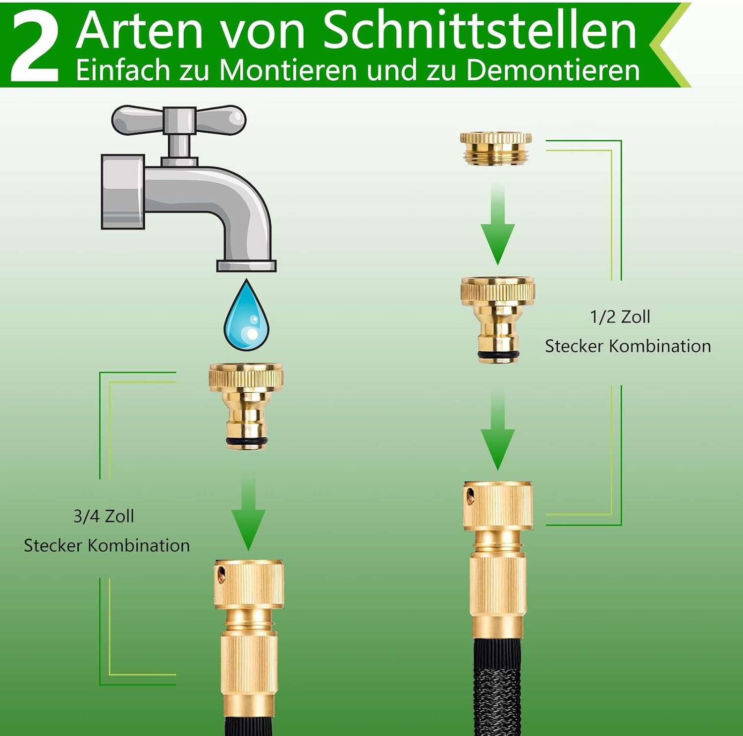 Ein ausziehbarer Gartenschlauch dehnt sich bei Wasserdruck automatisch auf seine volle Länge aus und zieht sich nach dem Gebrauch von selbst wieder zusammen. Das im Set enthaltene Zubehör, wie die praktischen Schlauchverbinder und 1/2 sowie 3/4 Zoll Adapter, sorgt dabei für einen mühelosen Anschluss an gängige Wasserquellen.