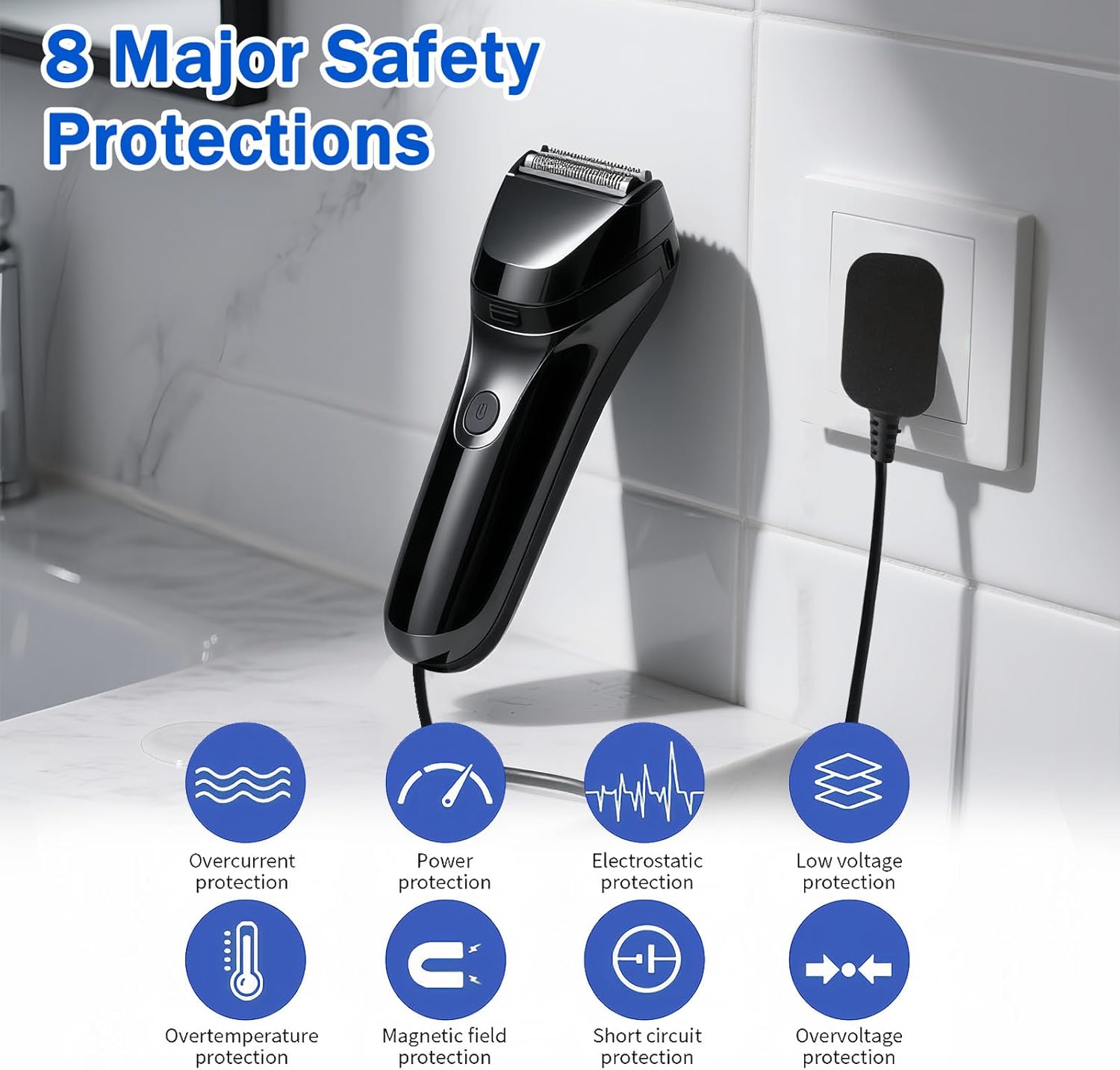 Unser Team hat getestet, dass die integrierten Sicherheitsfunktionen zuverlässig arbeiten. Der Überspannungsschutz verhindert Schäden am Rasierer bei Stromschwankungen, der Überstromschutz greift bei Fehlfunktionen im Gerät, und der Kurzschlussschutz unterbricht die Stromzufuhr sofort bei Kontaktproblemen. Das Gehäuse aus flammhemmendem ABS-Material bleibt auch nach mehrstündigem Betrieb nur handwarm – ein Zeichen für effiziente Wärmeableitung.