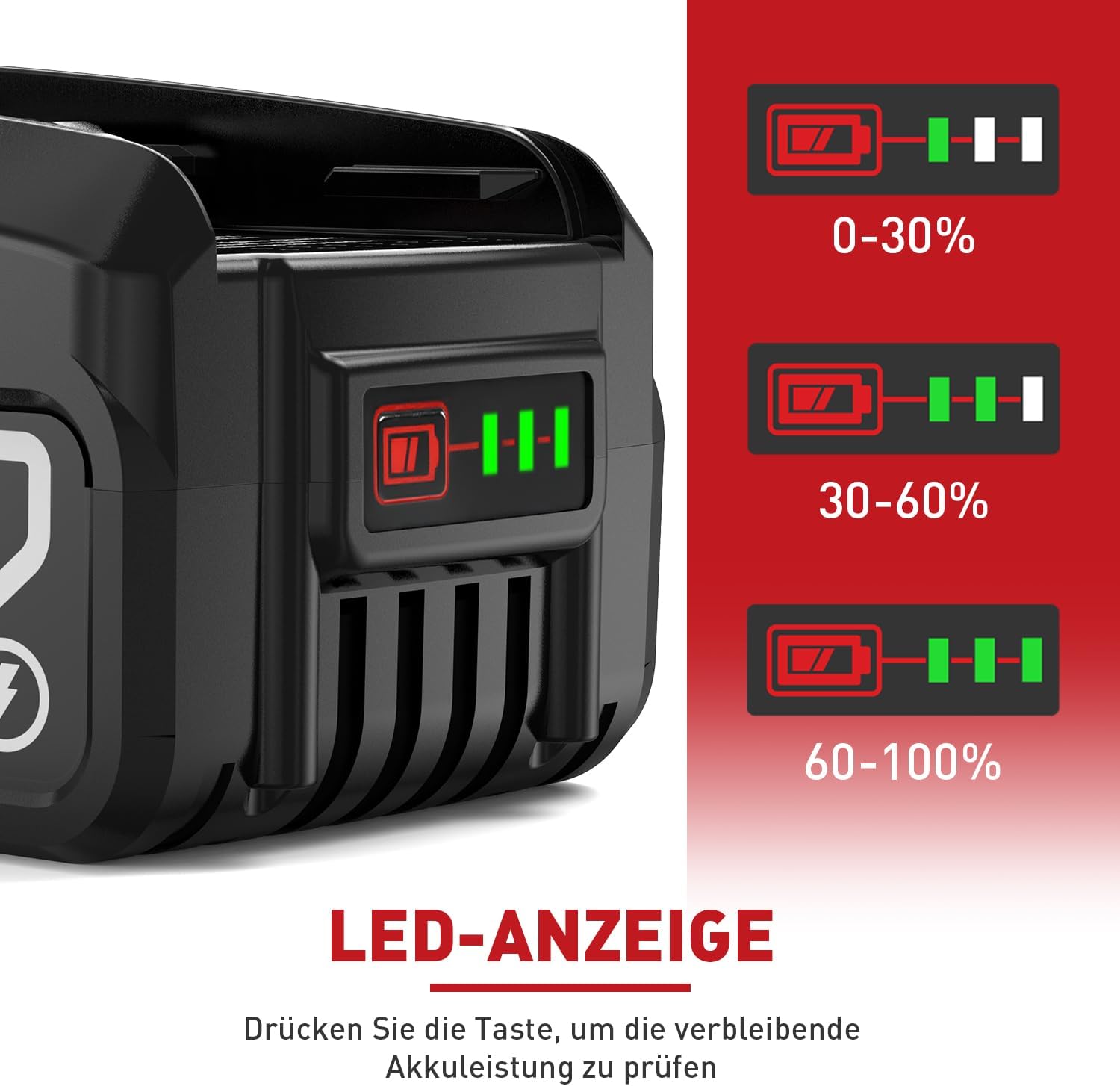 Während Standardakkus oft geringere Kapazitäten aufweisen, bietet dieser Ersatzakku eine große Kapazität von 5000mAh. Damit liefert er leistungsstarke Energie für eine längere Betriebsdauer Ihrer Werkzeuge.