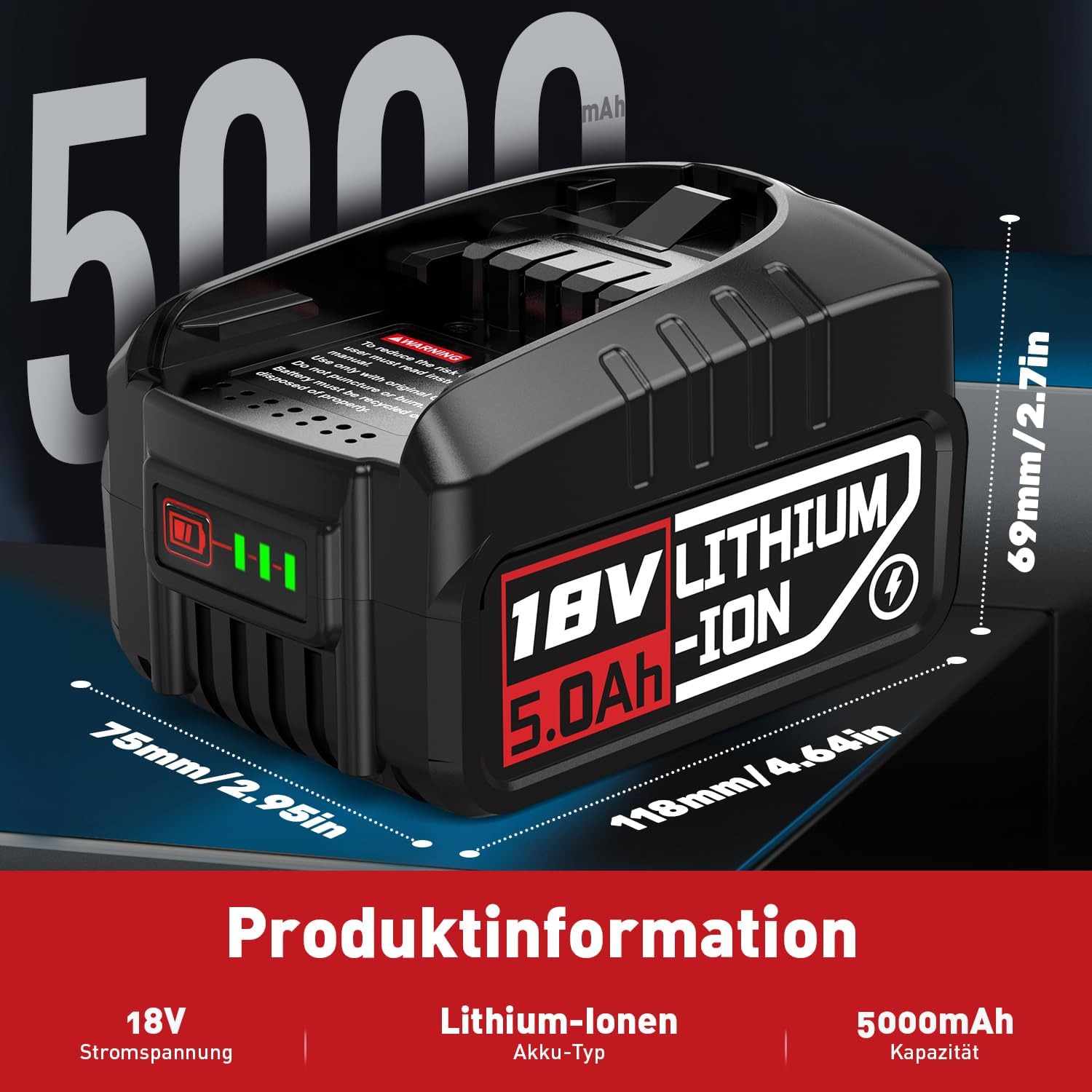 - Maximale Laufzeit: Die Kapazität von 5000mAh ermöglicht deutlich längere Einsätze im Vergleich zu Standardakkus, ideal für akkuintensive Arbeiten.