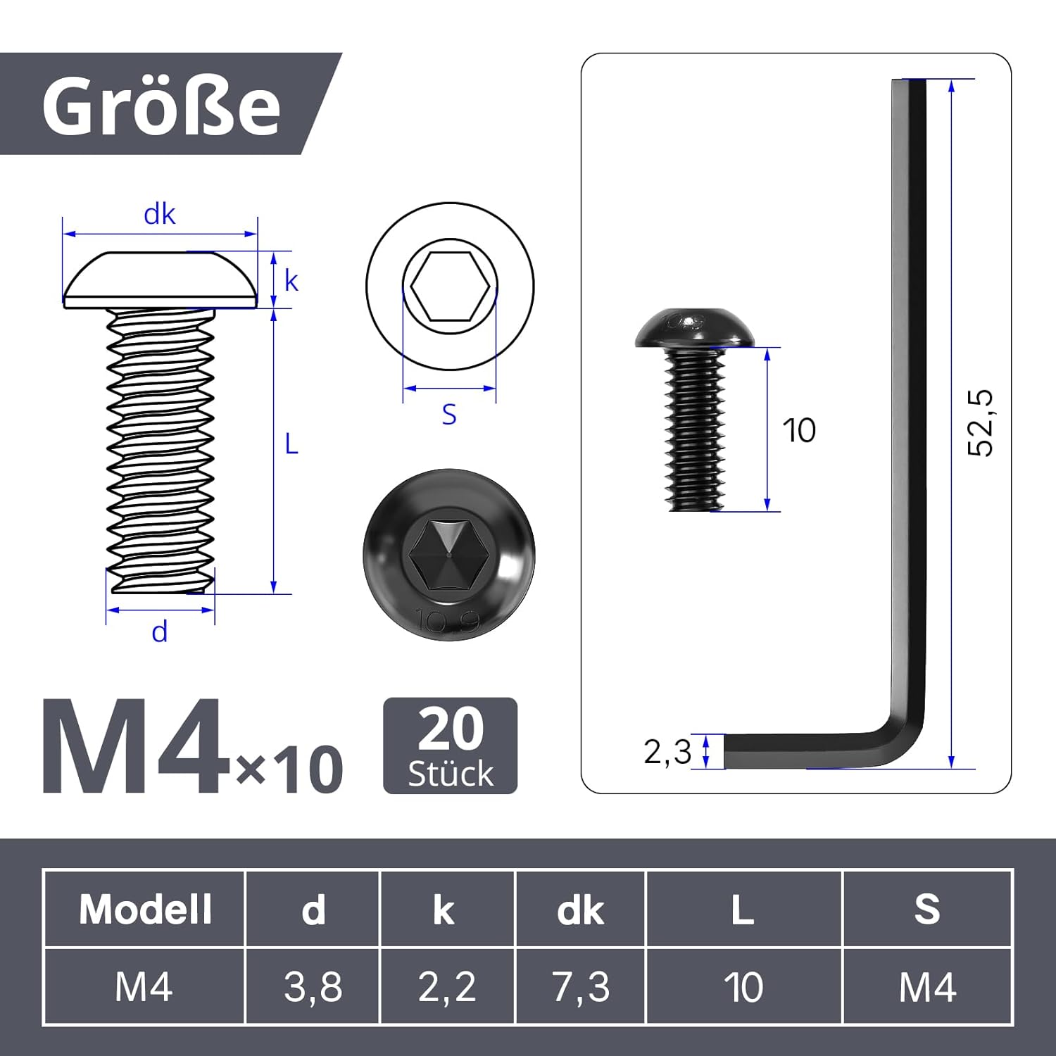 Diese M4 x 10 Linsenkopfschrauben sind die ideale Lösung für Heimwerker, Modellbauer und Techniker, die eine präzise Befestigung für kleine Bauteile benötigen. Mit dem beiliegenden Innensechskantschlüssel gelingt die Montage effizient und ohne die Notwendigkeit, weiteres Werkzeug zur Hand zu nehmen.
