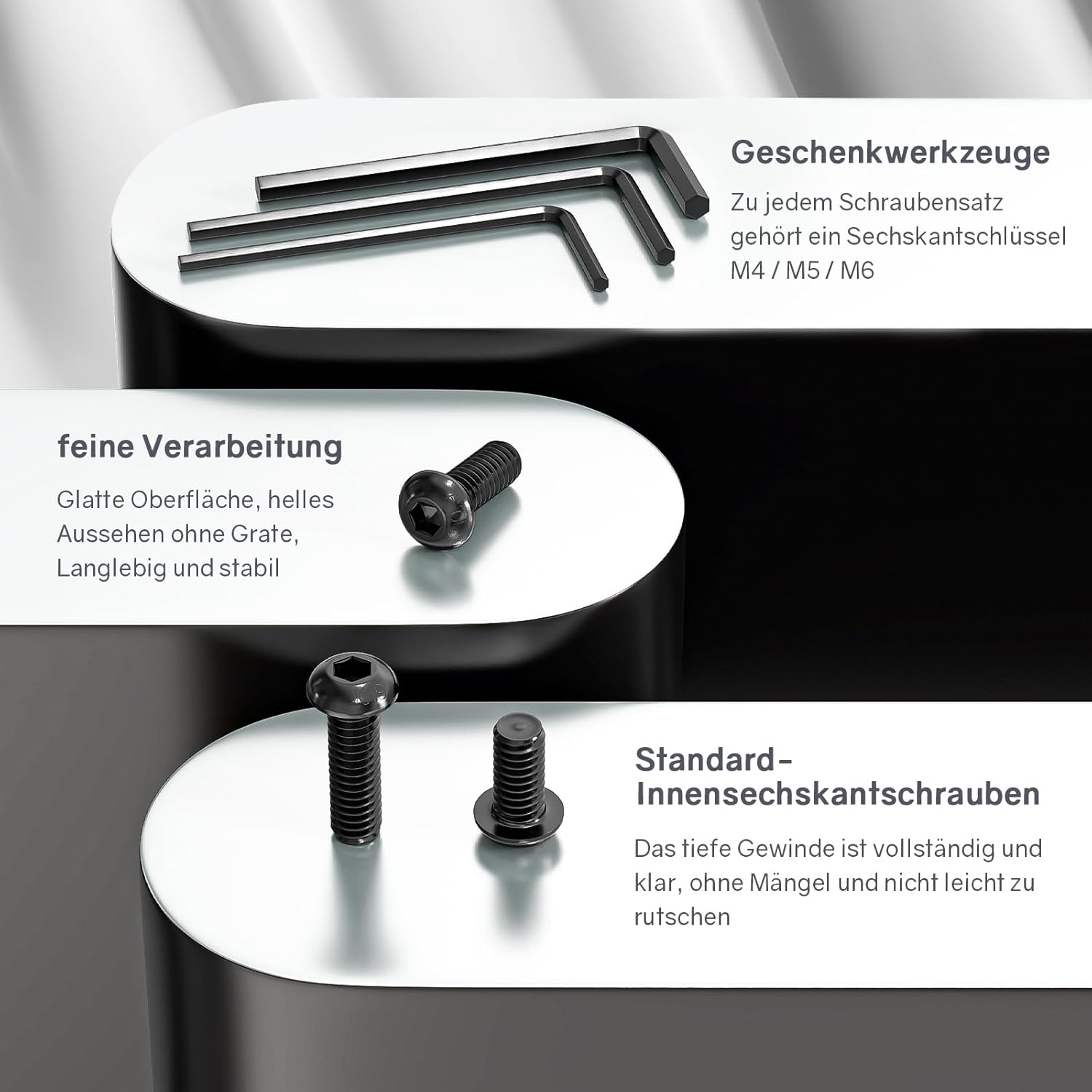 Dank der kompakten Bauweise lassen sich diese Schrauben auch in schwer zugänglichen Bereichen montieren, da der beiliegende L-Schlüssel kurz genug ist, um auch bei beengten Platzverhältnissen in PC-Gehäusen oder Maschinenbaugruppen zu arbeiten. Entdecke weiteres Zubehör in unseren Befestigungstechnik-Kategorien.