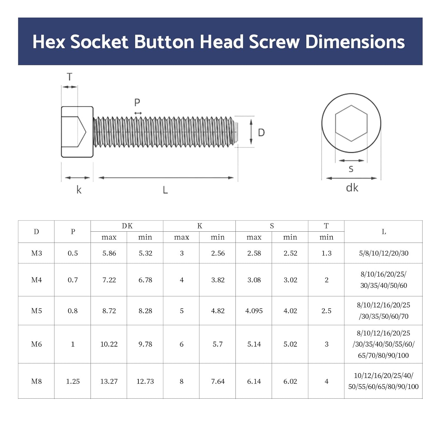 Der Kopfdurchmesser (dk) beträgt bei diesen Schrauben 10,22 mm bei einer Kopfhöhe (k) von 6 mm. Für die Betätigung der Innensechskantschraube wird ein Schlüssel mit einer Weite (s) von 5,14 mm benötigt.