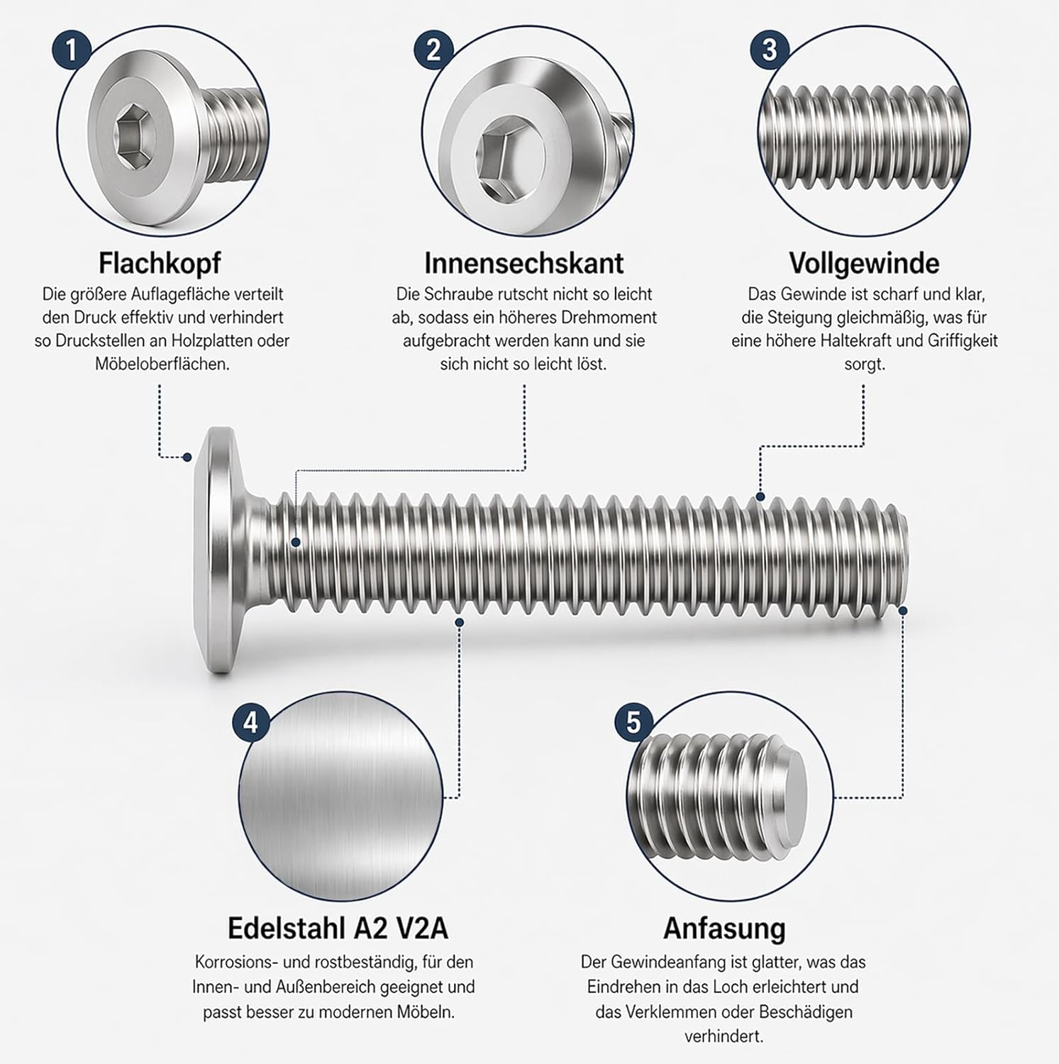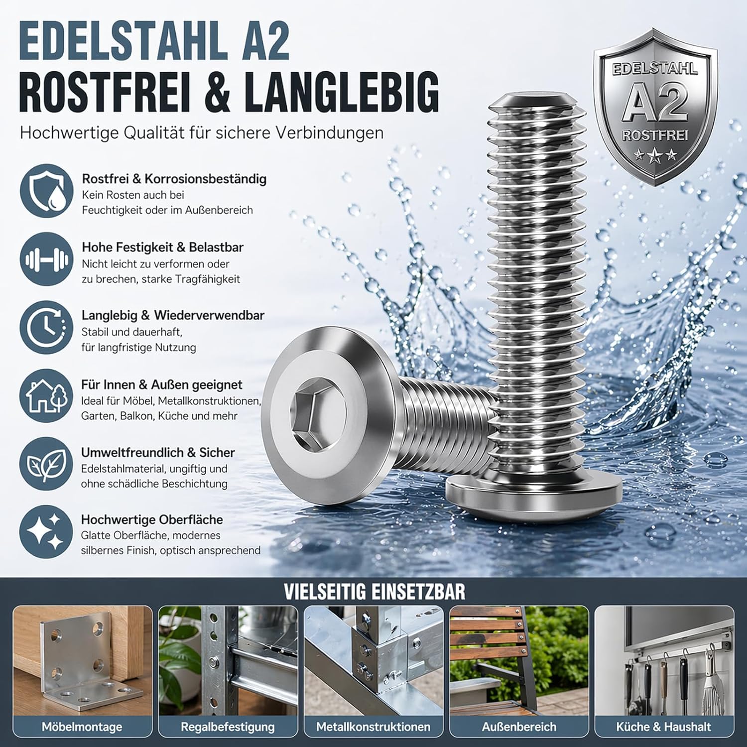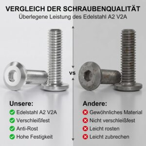 - Edelstahl A2 V2A Legierung: Bietet dir wirksamen Schutz vor Korrosion und Rost, wodurch die Schrauben auch bei feuchter Witterung im Außenbereich dauerhaft halten.