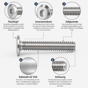 - Optimierte Kopfgeometrie: Der flache Kopf liegt nach der Montage nahezu plan an, was Reibung an anderen Bauteilen minimiert und für eine absolut saubere Front sorgt.