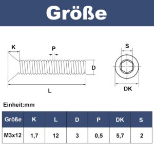 Die Bezeichnung M3 gibt den Nenndurchmesser des Schraubengewindes in Millimetern an, während die 12 mm die Länge des Gewindes bzw. bei dieser Kopfform die Gesamtlänge der Schraube beschreiben. Mit einem Innensechskant-Antrieb von 2 mm lassen sich diese Schrauben präzise und einfach verarbeiten.