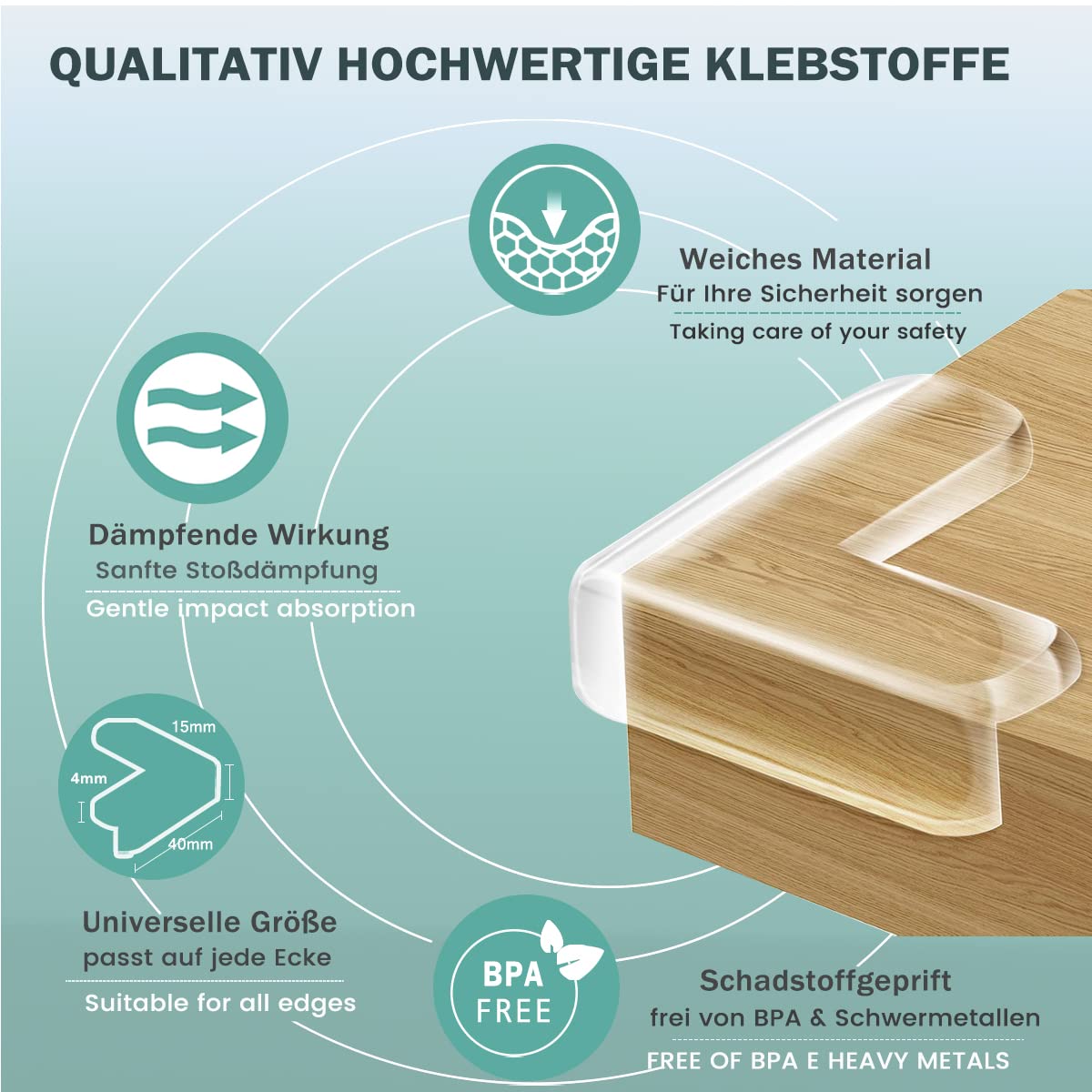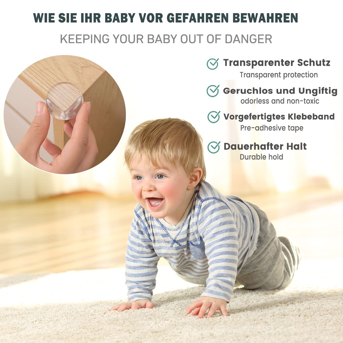 Sicherheit steht hier an erster Stelle, weshalb bei der Entwicklung besonderer Wert auf eine starke Haftung gelegt wurde. Da die Eckschützer speziell für die Anforderungen an die Babysicherheit optimiert wurden, halten sie auch neugierigen Kinderhänden stand. So müssen Sie sich keine Sorgen machen, dass der Schutz vorzeitig abgelöst wird.