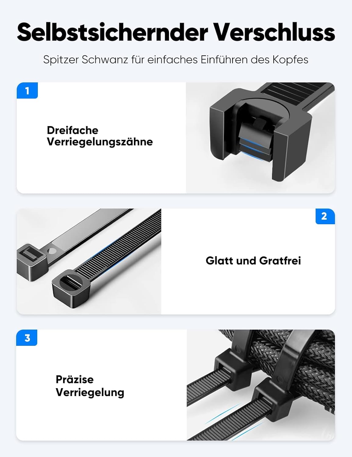- Erhöhte Zugfestigkeit: Das spezielle Design mit dreifachen Verriegelungszähnen bietet eine um 15-30 % höhere Haltekraft als herkömmliche Standard-Kabelbinder bei bis zu 18 kg Zuglast.