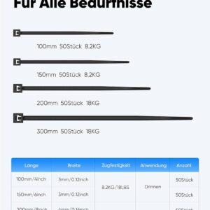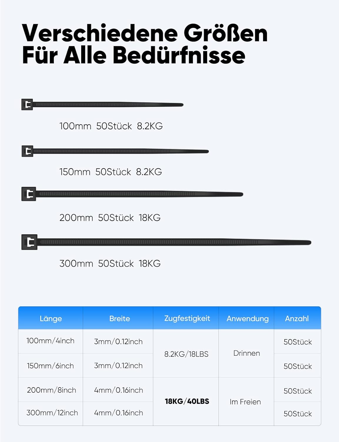 - Vier Längen zur Auswahl: Durch die Kombination von 100, 150, 200 und 300 mm Länge hast du für jede Anforderung – vom minimalen Durchmesser bis zum großen Rohrbündel – das passende Bindematerial parat.
