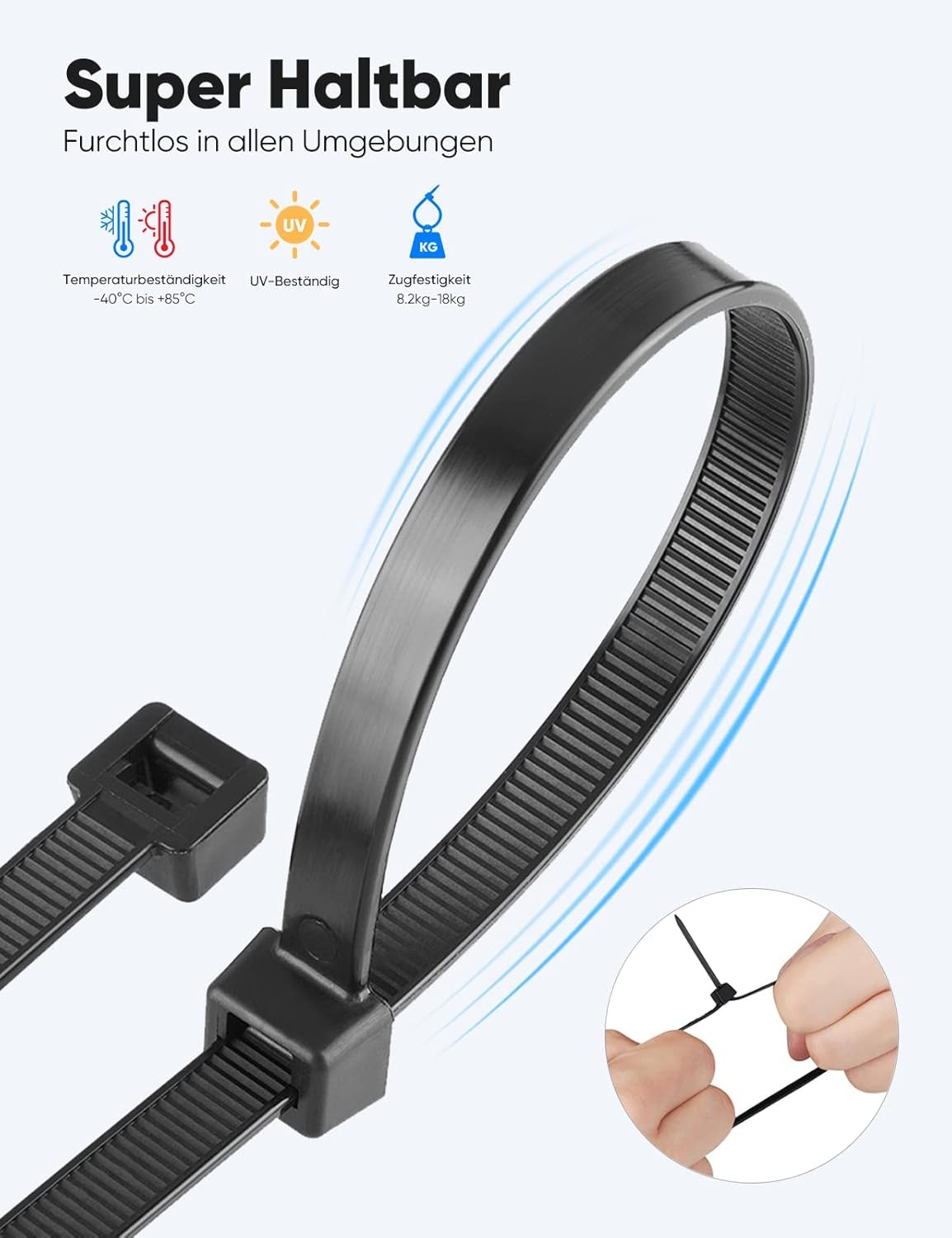 - Lagerung: Um die Materialeigenschaften langfristig zu erhalten, lagere die Kabelbinder kühl und dunkel in der Originalverpackung.