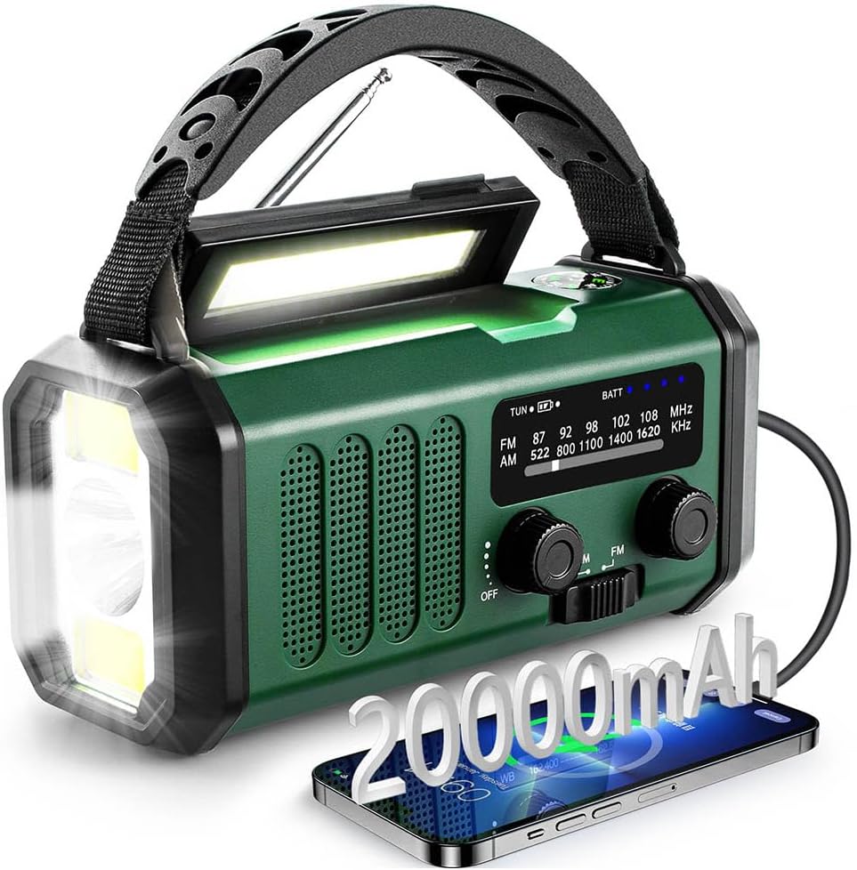 20000 mAh tragbares Notfall-Radio, SOS-Alarm, FM/AM-Radio mit Leselampe, Kompass, Kurbelgenerator und Solarladung, für den Außenbereich, Notfallladung für Smartphones (Grün) – Winnes