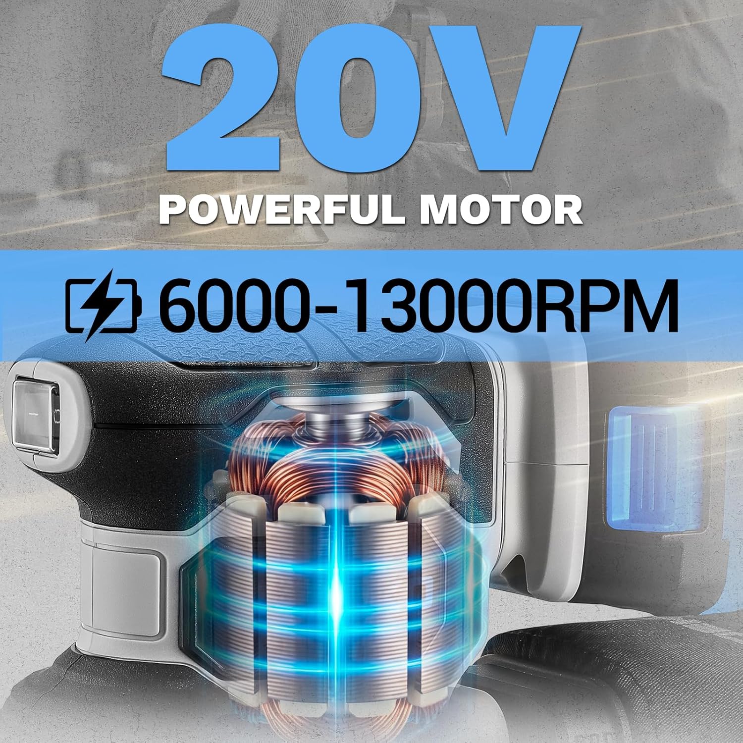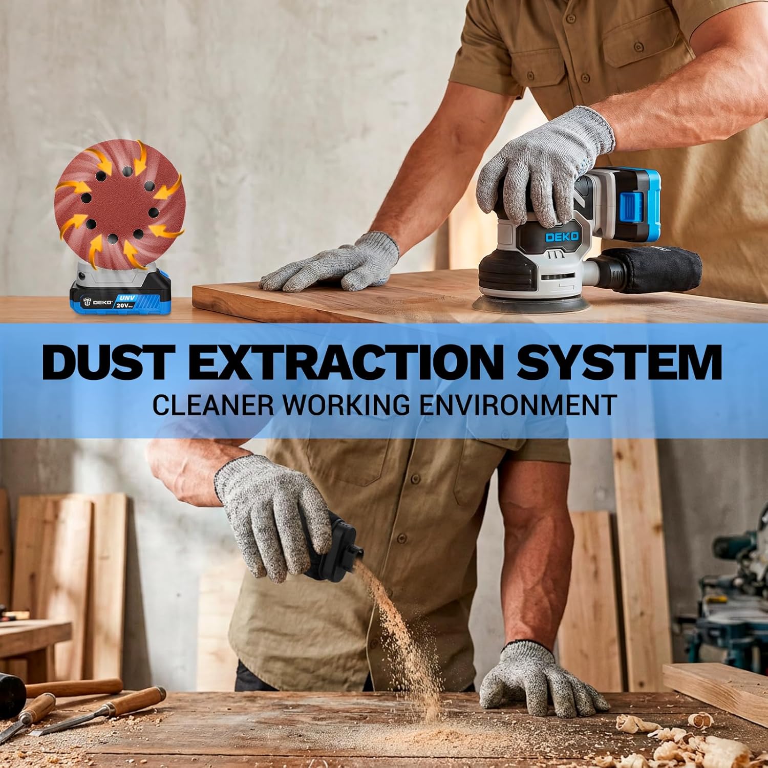 Der DEKOPRO 20V Exzenterschleifer kombiniert kabellose Bewegungsfreiheit mit solider Schleifleistung für typische Heimwerker-Aufgaben. Das Herzstück bildet der vibrationsarme Motor, der eine Drehzahl von bis zu 13.000 U/min erreicht. Über das Einstellrad an der Oberseite regulierst du die Geschwindigkeit stufenlos in 7 Stufen – so kannst du sensible Oberflächen schonend bearbeiten oder bei gröberem Materialabtrag mit voller Power arbeiten.