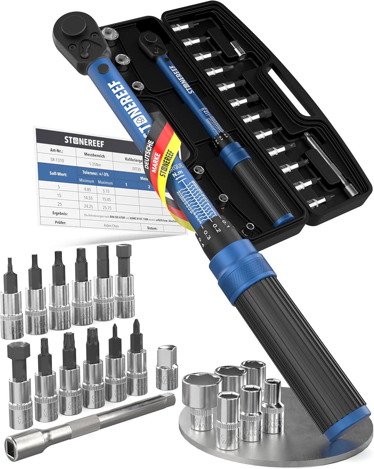 Dieses 21-teilige Drehmomentschlüssel-Set ist die erste Wahl für ambitionierte Zweirad-Schrauber, die beim Aufbau und der Wartung von Fahrrädern, MTBs und E-Bikes kein Risiko eingehen wollen. Mit dem Bereich von 1–25 Nm stellst du sicher, dass empfindliche Leichtbauteile aus Carbon oder Aluminium exakt mit dem vom Hersteller vorgegebenen Wert festgezogen werden, ohne Materialschäden zu provozieren. Wer regelmäßig am eigenen Bike schraubt, holt sich hiermit das passende Werkzeug für präzise Reparaturen und den sicheren Service in die eigene Werkstatt.