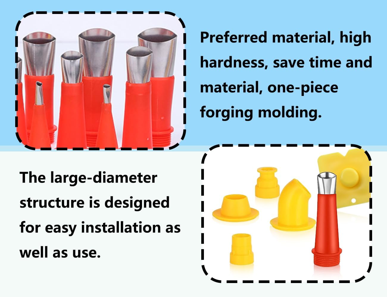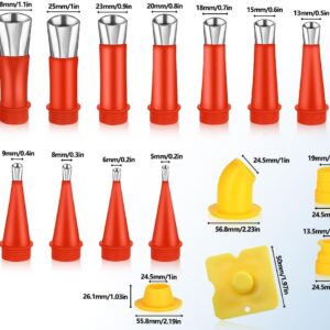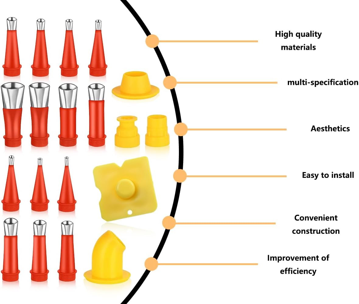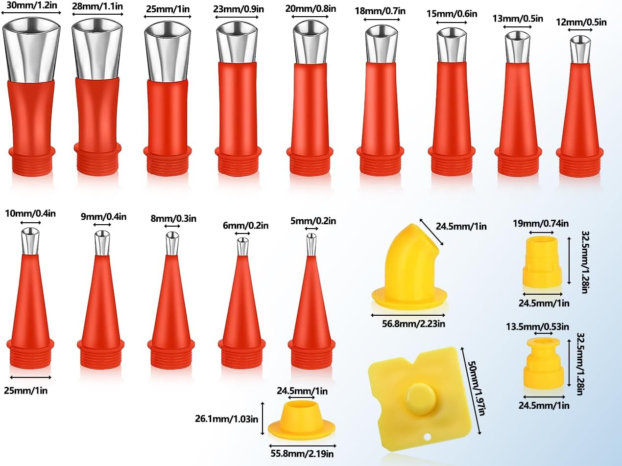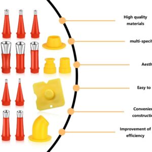 - [Mehrere Satzmenge]: Dieses 24-teilige Dichtungsdüsenset umfasst 14 Dichtungsdüsen, 6 Sockel und 4 Schaber. Diese Nietdüsen sind in verschiedenen Größen konzipiert und für verschiedene Neigungswinkel geeignet, wodurch die Vergussanforderungen unterschiedlicher Entfernungen erfüllt werden können Winkel, mit besserer Dichtleistung.