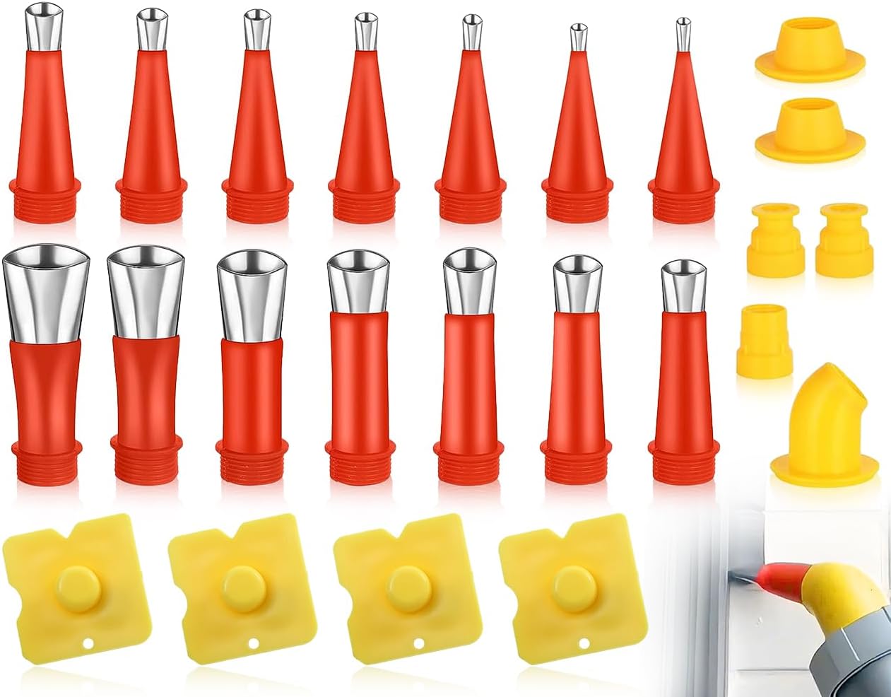 - [Edelstahl-Dichtungsdüsenset]: Dieses Set enthält 14 Dichtstoff-Dichtungsdüsen, 6 Sockel und 4 Schaber. Diese Düsen eignen sich ideal zum Abdichten und Abdichten.
