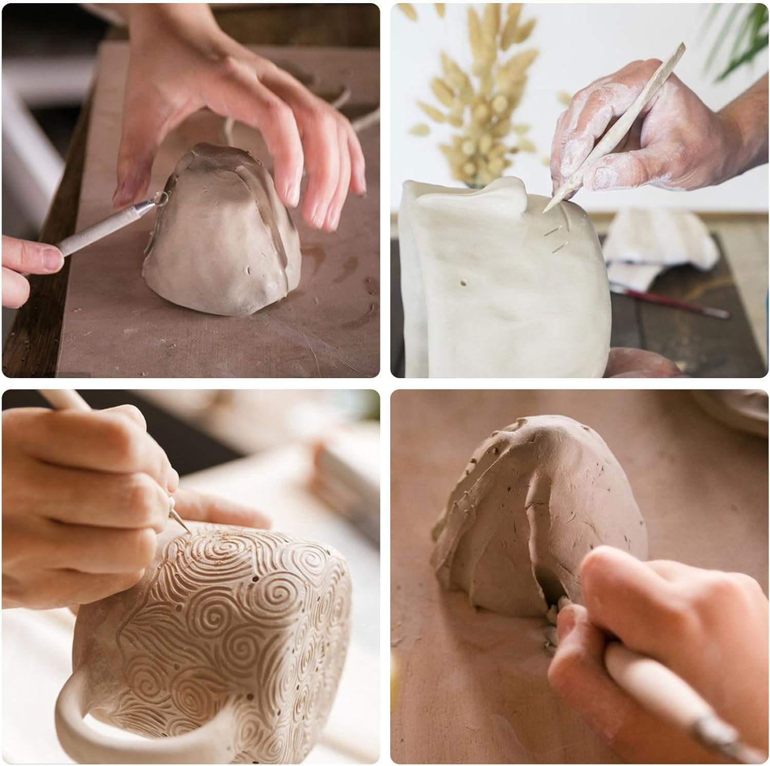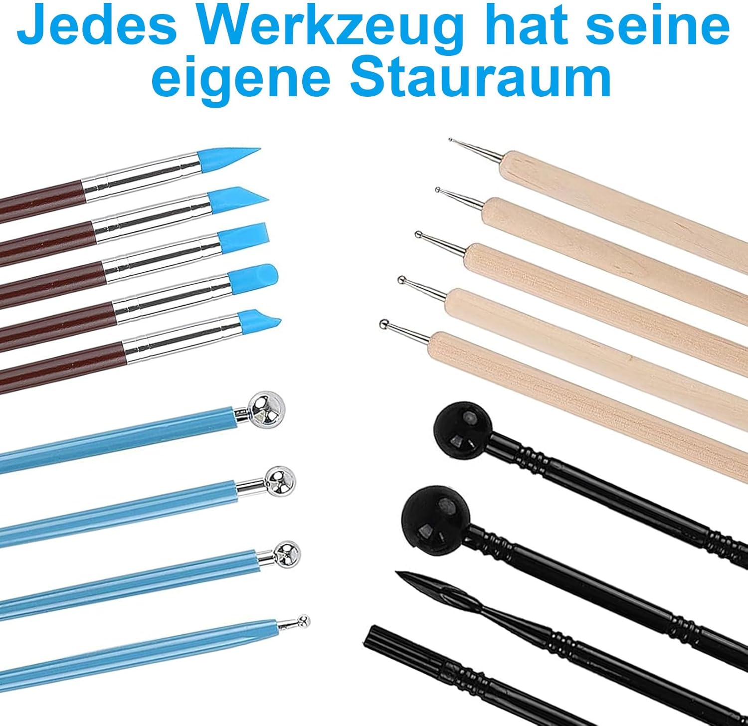 • Langlebige Materialwahl: Die Verwendung von hochwertigem Edelstahl, robustem Hartholz und schlagfestem Kunststoff sorgt für eine dauerhafte Stabilität selbst bei harten Modelliermassen.