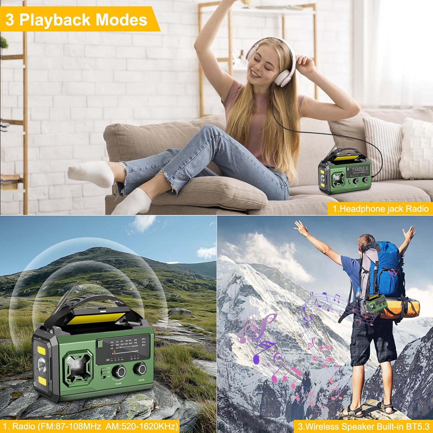 - 【Bluetooth 5.3 + Hi-Fi-Sound: Doppelter Hörgenuss】Über den Notfall hinaus ermöglicht die Upgraded Bluetooth 5.3 für sofortiges Pairing.Stereo-Lautsprecher mit kristallklaren Mitten und tiefen Bässen. FM/AM/NOAA Wetterwarnung Radio (87~108MHz/520~1710KHz) für Warnmeldungen in Bergregionen. 3.5mm Bluetooth-Wechsel, Das Wetterradio sendet bis zu 180 Stunden lang, und die Taschenlampe spendet über 59 Stunden lang Licht– ideal für Lagerfeuer-Abende oder Notfallinformationen.
