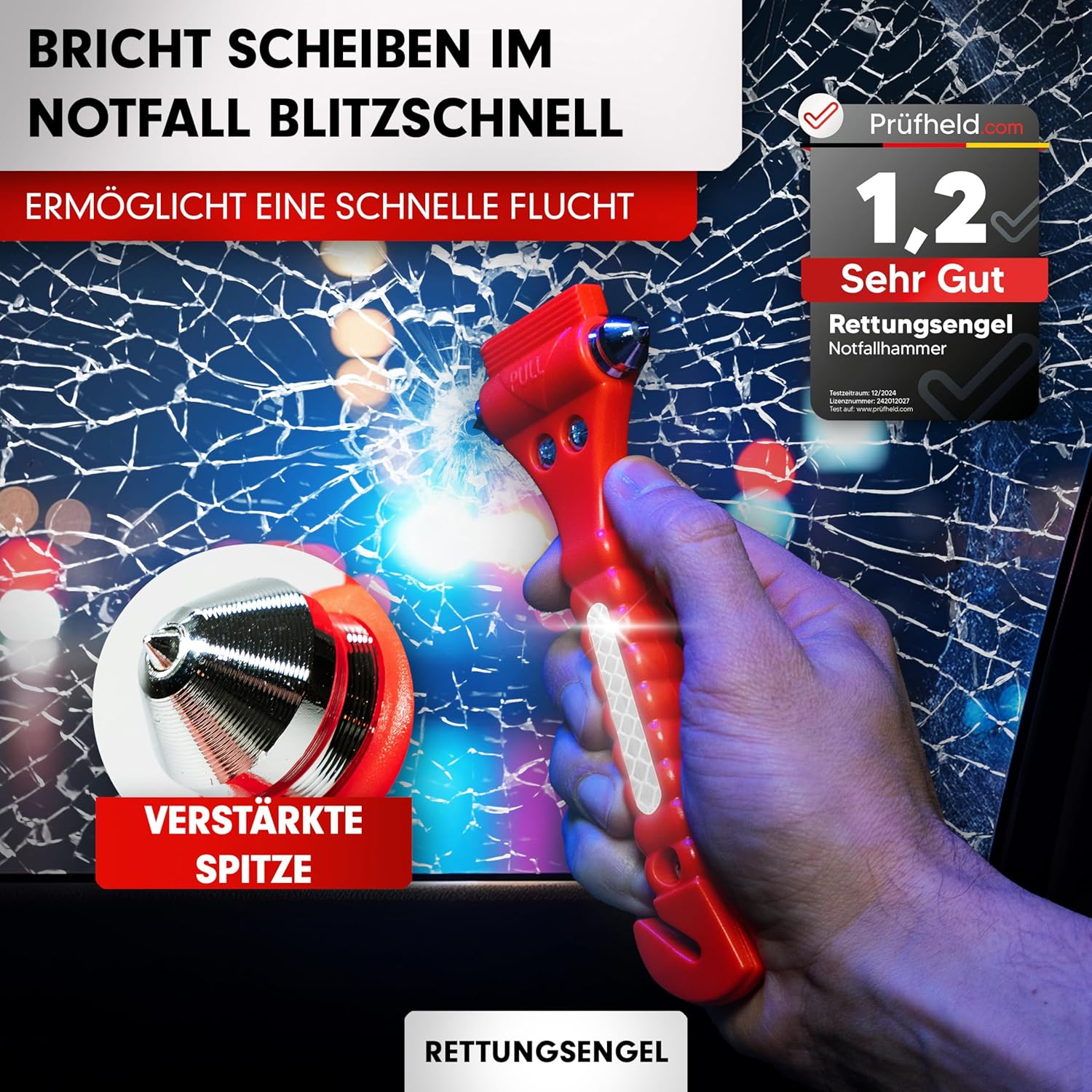 Der 2-in-1 Notfallhammer ist gezielt für das Durchschlagen von Seitenscheiben konzipiert, die aus Einscheiben-Sicherheitsglas bestehen. Windschutzscheiben bestehen hingegen oft aus Verbundglas, das sich deutlich schwieriger durchschlagen lässt. Nutzen Sie das Werkzeug daher bevorzugt für die Seitenscheiben des Fahrzeugs.