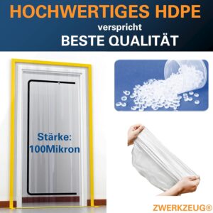 Bei Renovierungen ist der größte Frust nicht die Arbeit selbst, sondern der Schmutz, der sich im gesamten Gebäude verteilt. Das 2x ZWERKZEUG® 2x Staubschutztüren-Set schafft hier eine professionelle Lösung. Die Folien bestehen aus 100 Mikron starkem LDPE, einem Material, das flexibel bleibt und nicht zur Sprödigkeit neigt – eine klare Verbesserung gegenüber herkömmlicher, dünner Baufolie, die oft schon beim Aufkleben einreißt.