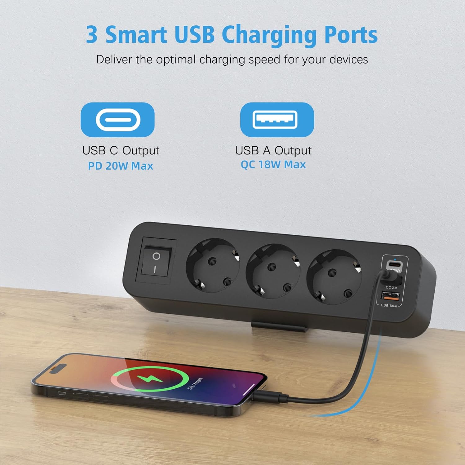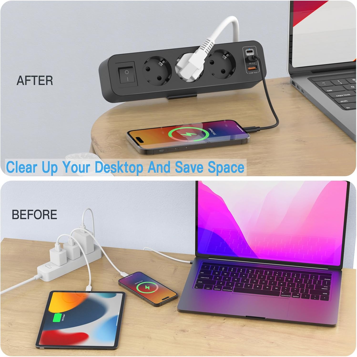 Die 3 Fach Tischsteckdose mit 2 QC und Typ-C PD20W ist die optimale Stromversorgungslösung für Handwerker, Ingenieure und ambitionierte Heimwerker an ihrem Arbeitsplatz. Mit dieser kompakten 7-in-1-Einheit organisierst du deinen Arbeitsbereich effizient und stellst gleichzeitig sicher, dass alle deine elektronischen Werkzeuge und mobilen Geräte jederzeit einsatzbereit sind.