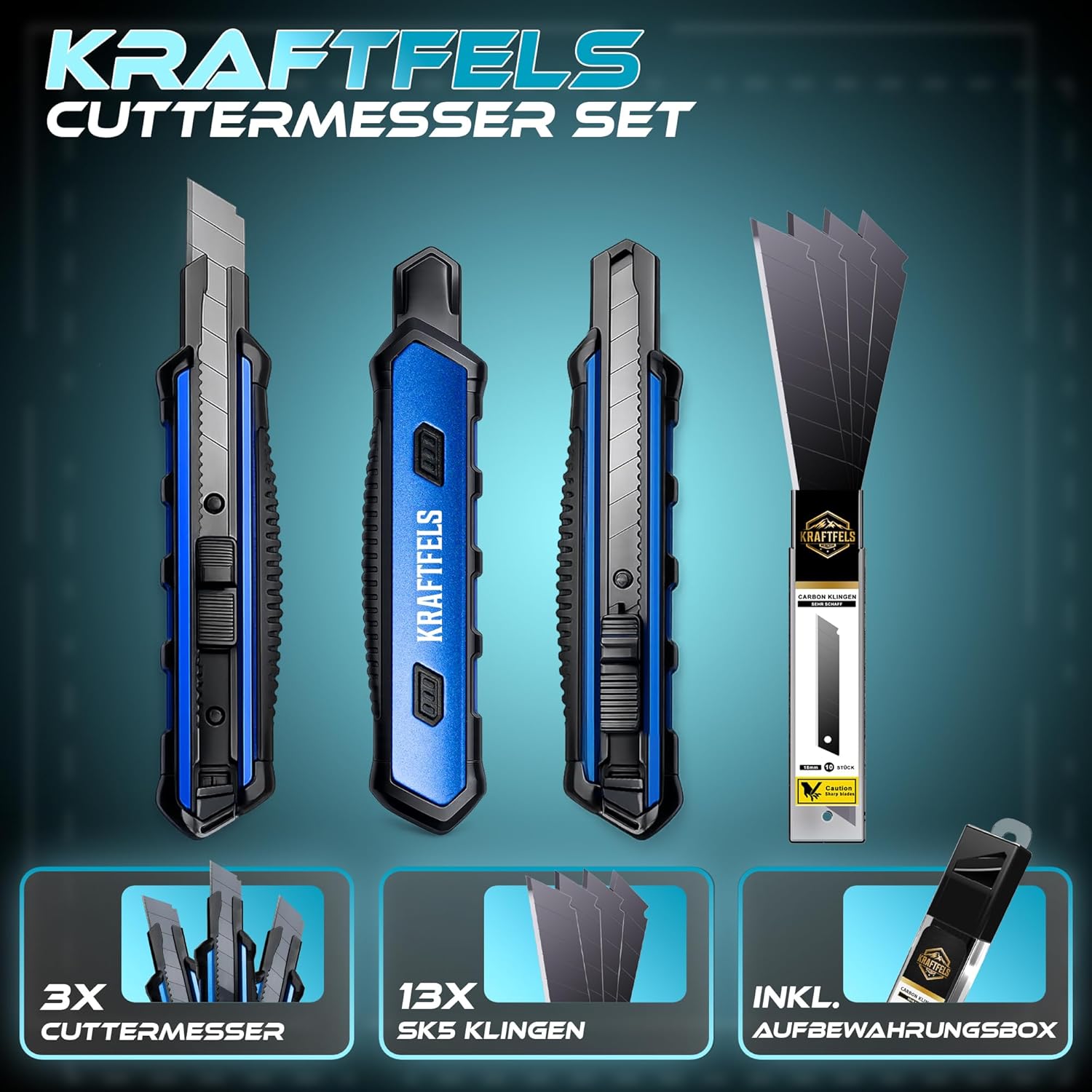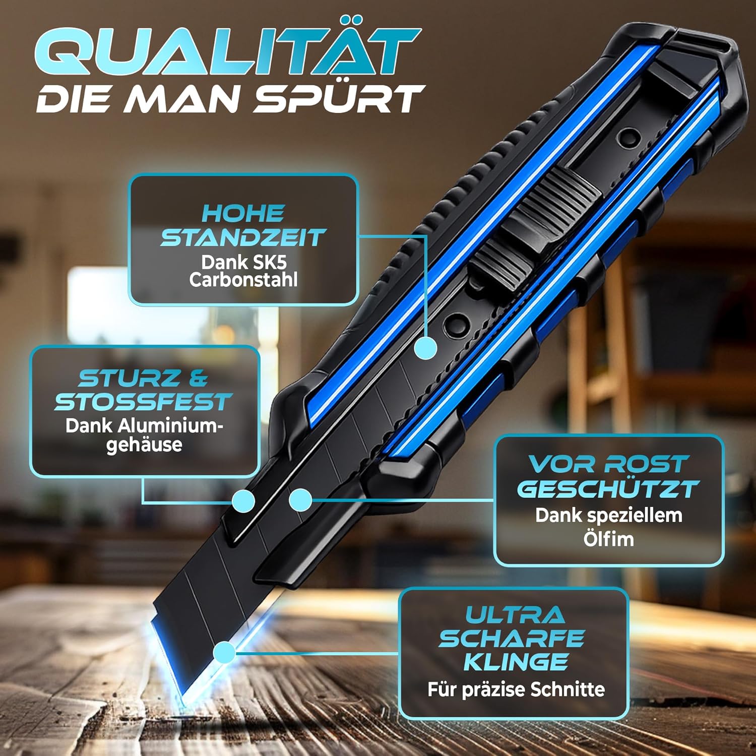 Das Set überzeugt durch ein robustes Aluminium-Gehäuse und eine hohe Anwenderzufriedenheit mit einer Bewertung von 4,6 von 5 Sternen. Die beiliegenden 18mm Abbrechklingen sind extrem scharf geschliffen und besonders stabil gefertigt, um jederzeit präzise und professionelle Ergebnisse bei verschiedenen Schneidarbeiten zu ermöglichen.