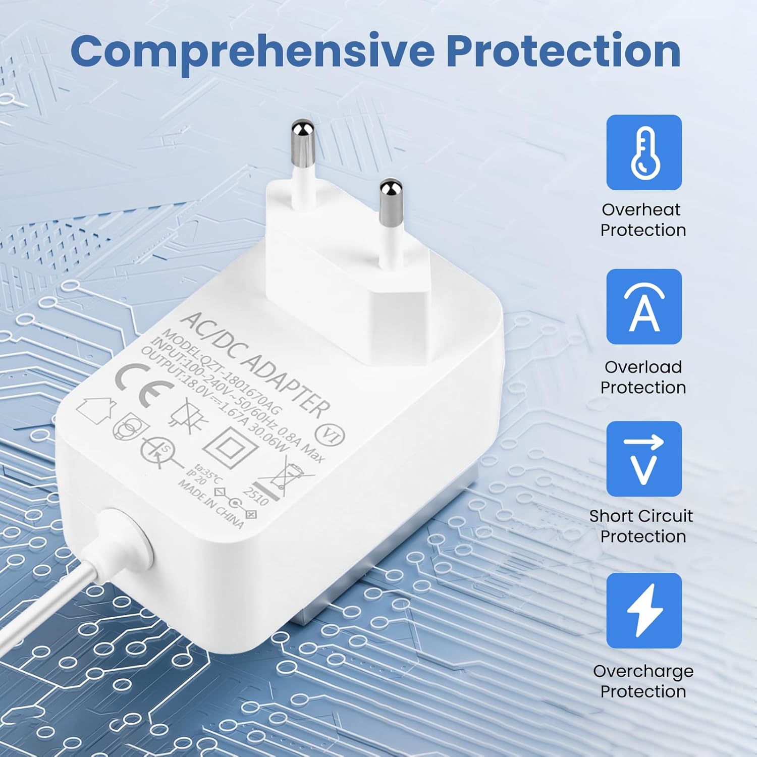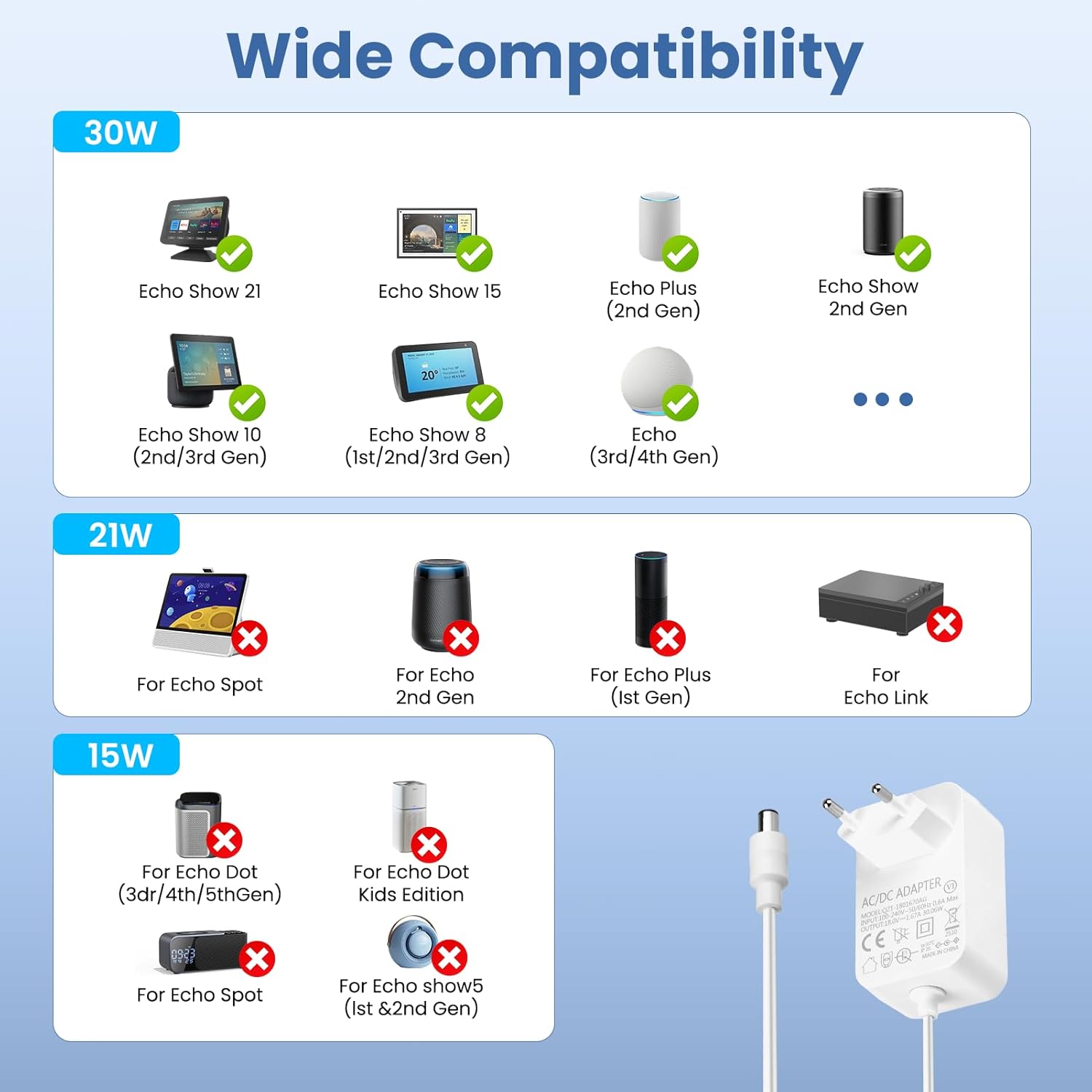 - Präzise Ausgangsleistung: Mit 18V und 1,67A ist das Netzteil exakt auf die Leistungsaufnahme der Echo-Serie abgestimmt, was ein flackerfreies Display und unterbrechungsfreie Verbindungen garantiert.