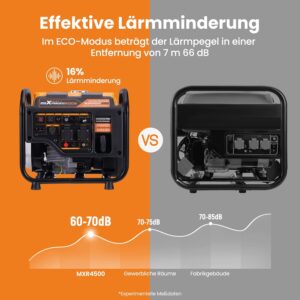 - Laufzeitoptimierung per ECO-Modus: Die intelligente Drehzahlregulierung passt den Verbrauch an die benötigte Last an, was bei moderater Auslastung eine Laufzeit von bis zu 14 Stunden ermöglicht.
