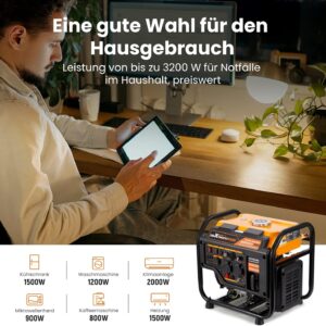 Ob auf der abgelegenen Baustelle, in der Werkstatt oder als autarke Notstromlösung für Zuhause: Der 3200W Inverter-Generator liefert dir die Energie, die du dort benötigst, wo keine Steckdose in der Nähe ist. Dieses kompakte Kraftpaket ist die ideale Wahl für Handwerker und Anwender, die bei ihren mobilen Elektrogeräten keine Leistungseinbußen in Kauf nehmen wollen.