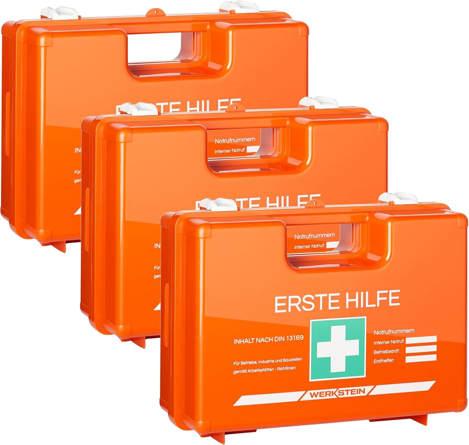 Die DIN 13169 definiert einen Verbandkasten, der inhaltlich genau doppelt so groß ist wie der nach DIN 13157. Während die DIN 13157 für kleinere Betriebe und Baustellen geeignet ist, ist der WERKSTEIN Verbandkasten nach DIN 13169 optimal für größere Unternehmen und Einrichtungen ausgelegt.