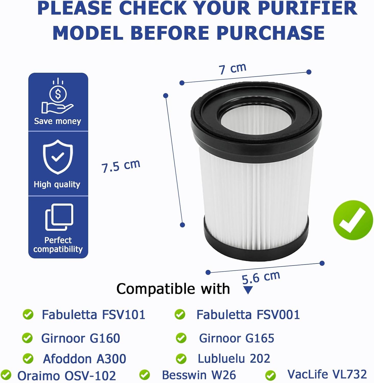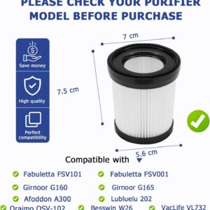 Die Filter sind kompatibel mit den Modellen Girnoor G160 & G165, Afoddon A300, Fabuletta FSV101 / FSV001 sowie Oraimo OSV-102, Besswin W26 und VacLife VL732. Bitte bestätigen Sie vor dem Kauf unbedingt Ihr spezifisches Robotermodell, um sicherzugehen.