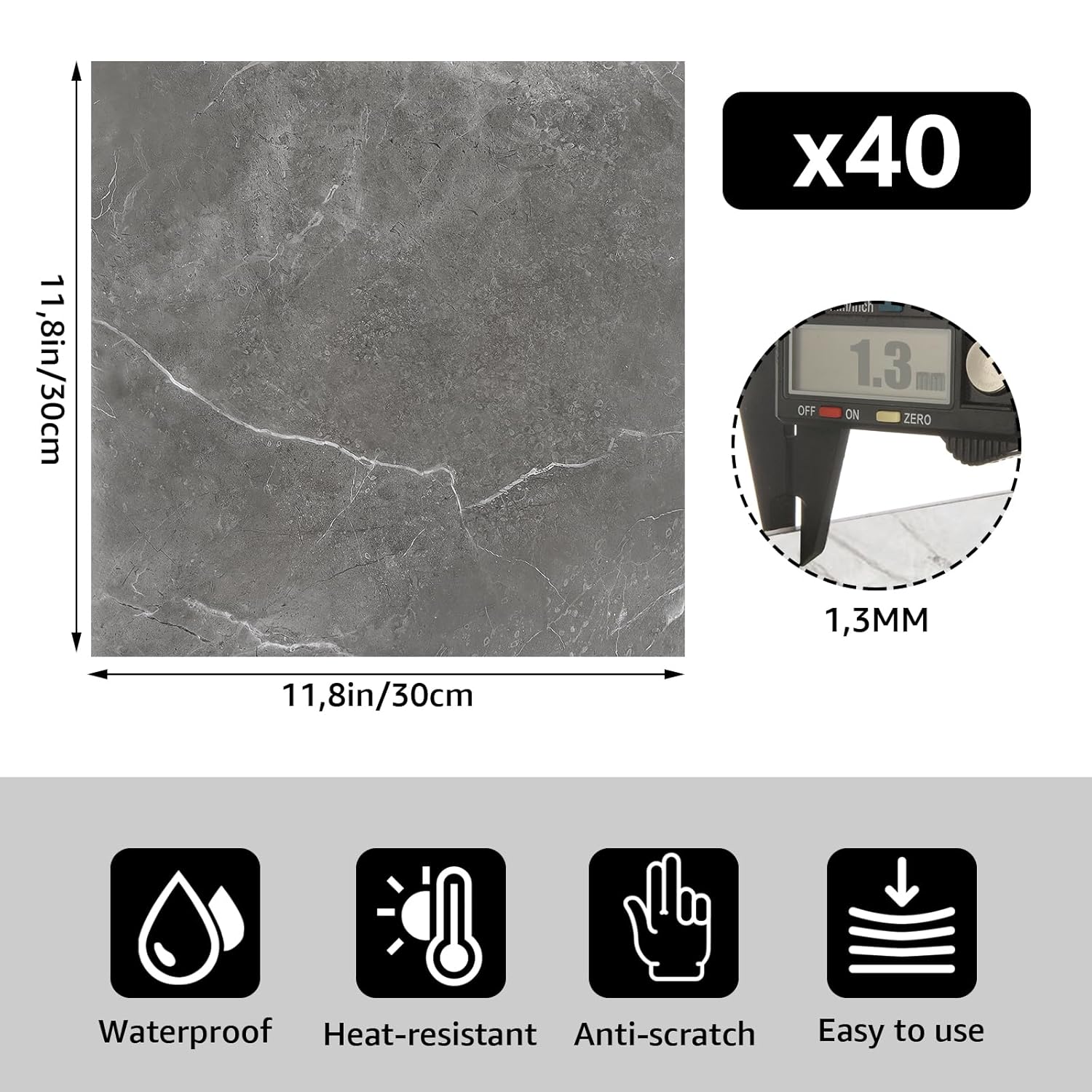 Jedes Set besteht aus 40 Fliesen, wobei jede einzelne Fliese eine Größe von 30×30 cm aufweist. Diese Anzahl ermöglicht es Ihnen, auch größere Flächen effizient mit der modernen Steinoptik neu zu gestalten. Die Fliesen sind eine praktische Lösung, um Räumen ohne aufwendige Renovierung neuen Glanz zu verleihen.