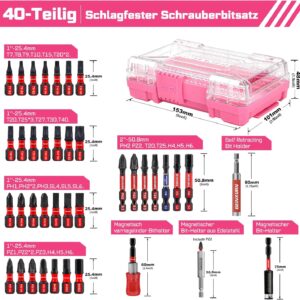 40-teiliger Schraubendreher-Bitsatz aus schlagfestem, S2-Stahl Magnetische Torx/Phillips/Pozidriv/Schlitz/Hex-Kopf Bit Set, 1/4” Sechskantschaft, inkl. Bit-Halter mit Rosa Aufbewahrungsbox