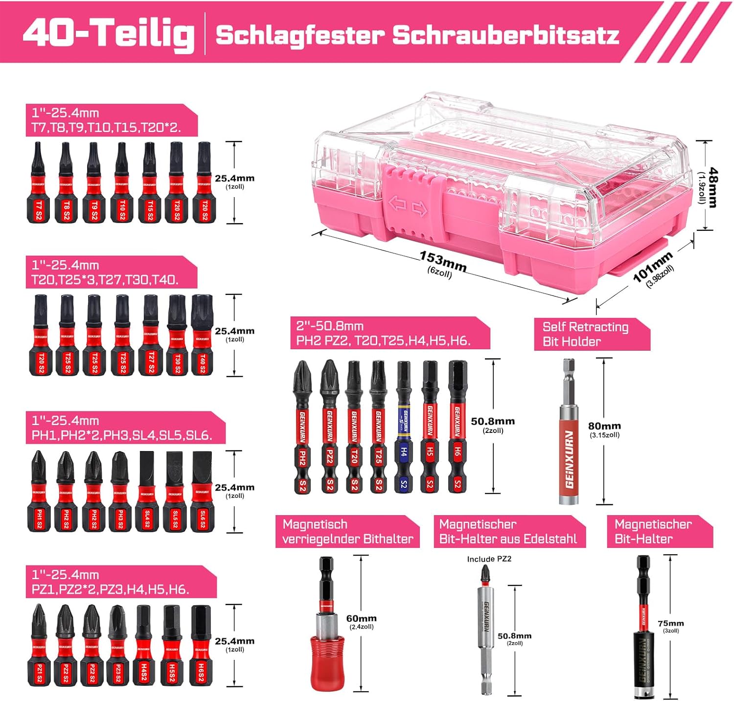40-teiliger Schraubendreher-Bitsatz aus schlagfestem, S2-Stahl Magnetische Torx/Phillips/Pozidriv/Schlitz/Hex-Kopf Bit Set, 1/4” Sechskantschaft, inkl. Bit-Halter mit Rosa Aufbewahrungsbox 40-teiliger Schraubendreher-Bitsatz aus schlagfestem, S2-Stahl Magnetische Torx/Phillips/Pozidriv/Schlitz/Hex-Kopf Bit Set, 1/4” Sechskantschaft, inkl. Bit-Halter mit Rosa Aufbewahrungsbox