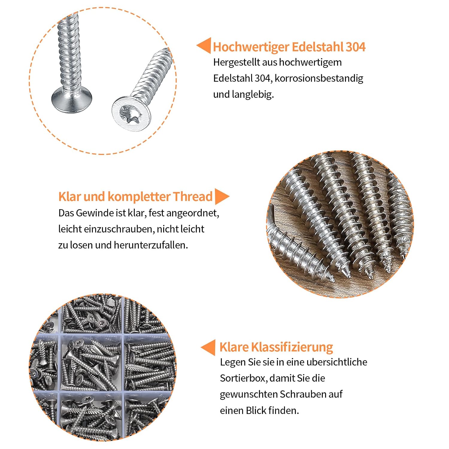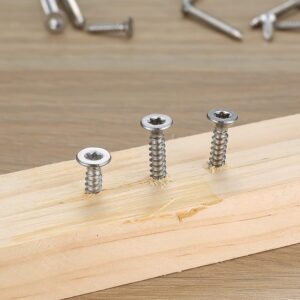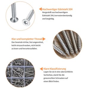 Das Schrauben-Sortiment besteht aus Edelstahl 304, der sich durch seine Korrosionsbeständigkeit von verzinkten Standard-Schrauben unterscheidet. Während verzinkte Schrauben in feuchten Umgebungen nach Monaten Rostflecken zeigen können, bleibt Edelstahl auch bei direktem Feuchtkontakt rostfrei. Die Senkkopf-Form mit 90°-Winkel sorgt dafür, dass Schraubenköpfe nach dem Eindrehen bündig mit der Oberfläche abschließen – wichtig bei sichtbaren Verschraubungen oder wenn Oberflächen später verspachtelt werden.