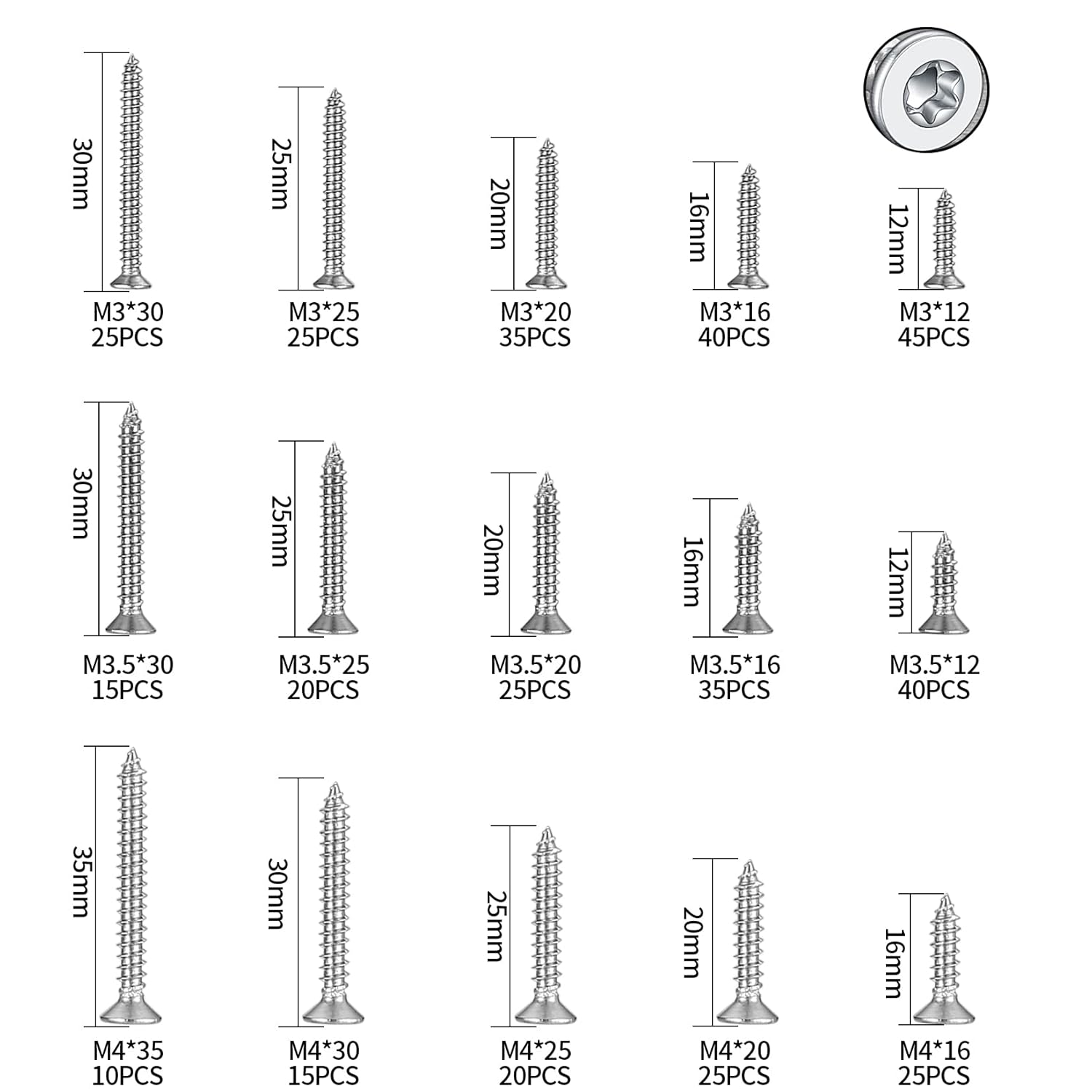Die transparente Sortierbox organisiert die 400 Schrauben nach Größen in sechs Fächern. Die Längenstaffelung (12mm, 16mm, 20mm, 25mm, 30mm, 35mm) deckt typische Anwendungsfälle ab: 12mm für dünne Materialien und Vorhangschienen, 16-20mm für Standard-Gipskarton-Verschraubungen, 25-30mm für dickere Holzverbindungen und 35mm für verstärkte Befestigungen. Die drei Durchmesser M3, M3.5 und M4 entsprechen gängigen Anforderungen – M3 für leichte Befestigungen, M3.5 als Allrounder und M4 für höhere Belastungen.