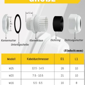 Das Set von Caianwin umfasst insgesamt 42 Kabelverschraubungen in vier gängigen Größen. Es enthält 12 Stück M12, 12 Stück M16, 12 Stück M20 sowie 6 Stück M25 Verschraubungen, um eine Vielzahl von Installationsanforderungen abzudecken.