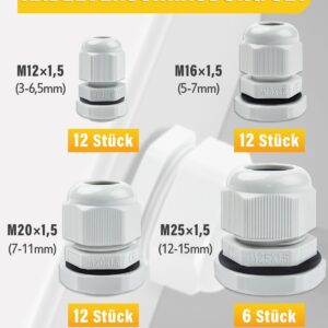 - Vollständiges Sortiment: Mit 42 Teilen in vier Größen (M12 bis M25) bist du für jedes Projekt am Verteiler oder Schaltkasten sofort einsatzbereit.