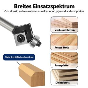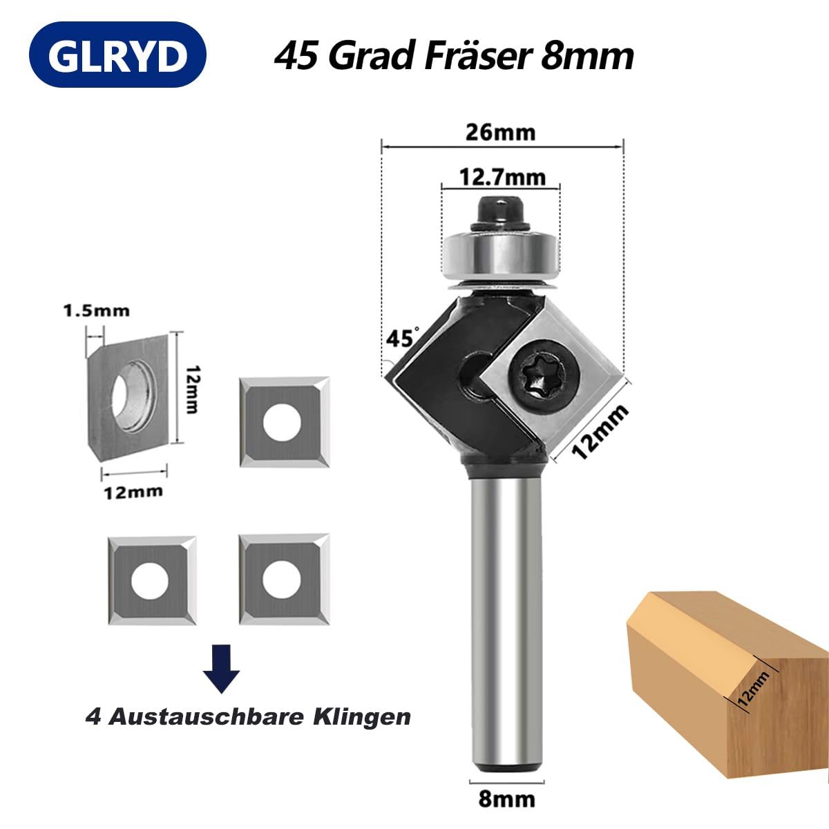 • 45 Grad Fräser 8mm: glryd dieser Oberfräser ist aus hochwertigem C3-Mikrokorn-Hartmetall gefertigt, fasefräser mit Schaft 8mm, 26mm Durchmesser, 4 Stück Wendeplatten grad 45° , wendeplatten 12mmx12mmx1.5mm, Bitte ziehen Sie die Schrauben vor Gebrauch wieder fest.
