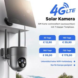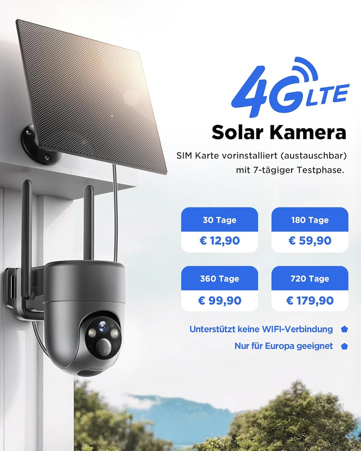 - 【Frei von WLAN-Abhängigkeit】: Unsere 4G Solar Überwachungskamera mit SIM Karte nutzt zuverlässige 4G-Netzwerke für schnelle und stabile Datenübertragung – die perfekte Lösung für Orte ohne WLAN-Zugang, wie Bauernhöfe, Gärten, Ställe oder Baustellen. In der 4G-Kamera ist bereits eine SIM-Karte mit 7-tägigem unbegrenztem Testdatenvolumen vorinstalliert. Man kann sie direkt nach dem Auspacken nutzen und sofort mit der Überwachung beginnen! Hinweis: Für die Dauerbenutzung nach dem Testzeitraum ist ein Datentarif erforderlich und diese Kamera Solar mit SIM Karte unterstützt keine WLAN-Verbindung