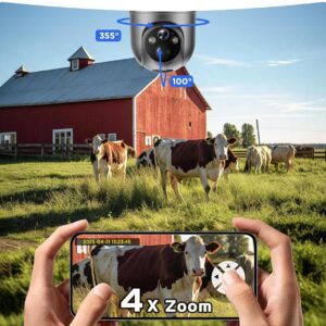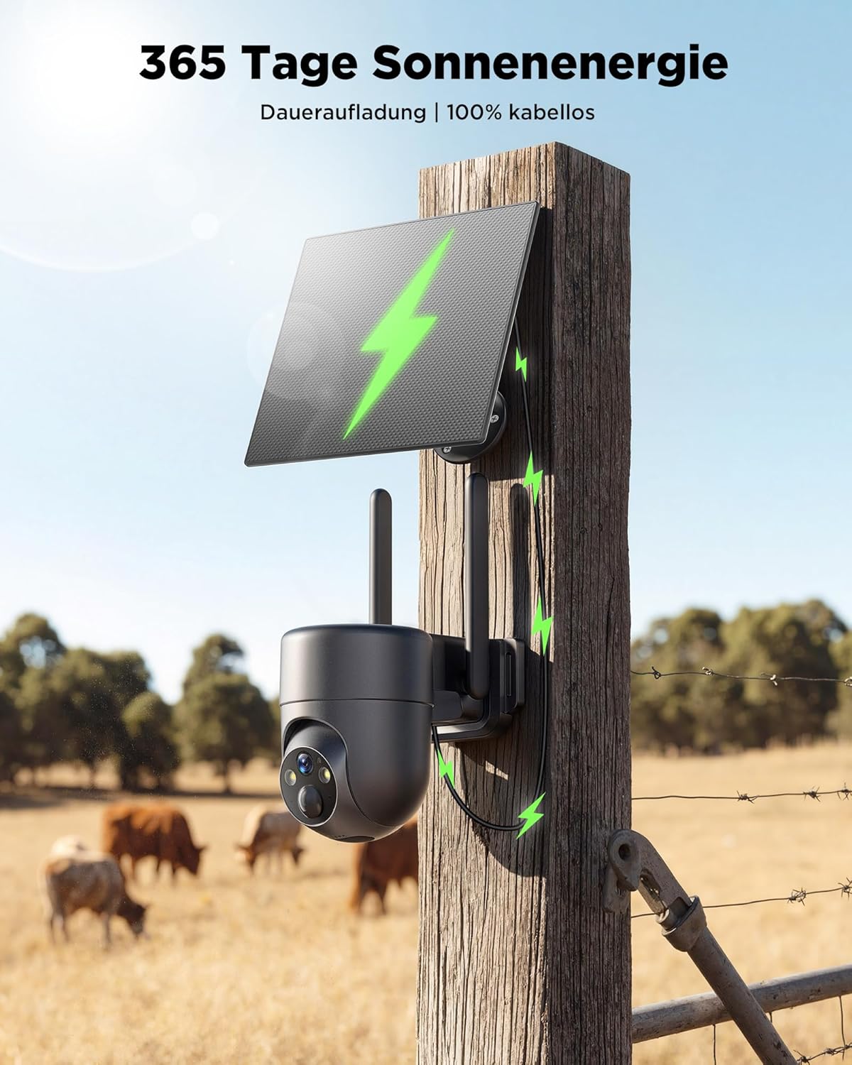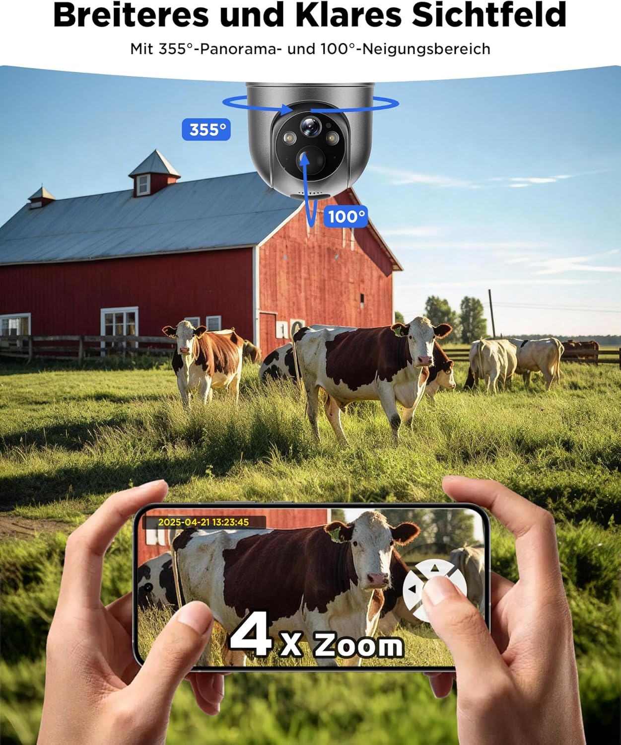 - 【2K HD & 360°-Panoramabild】: Man genießt kristallklare Überwachungsbilder mit 2K HD-Auflösung und 4-fachem digitalen Zoom. Die Überwachungskamera Solar mit SIM kann horizontal bis zu 355° und vertikal bis zu 100° drehen. Über die mobile App kann man die Überwachungskamera 4g ferngesteuert und erreicht so eine fast 360°-Cobertura ohne tote Winkel. Zudem bietet die Überwachungskamera Aussen mit SIM Karte eine Nachtsichtreichweite von 15 Metern und kann selbst in völliger Dunkelheit scharfe Bilder aufnehmen – Tag und Nacht sicherstellen, dass keine Details verloren gehen